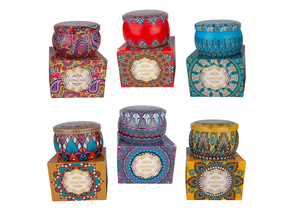 Mosaico candela con scatola in latta decorata diametro 8cm in 6 assortimenti
