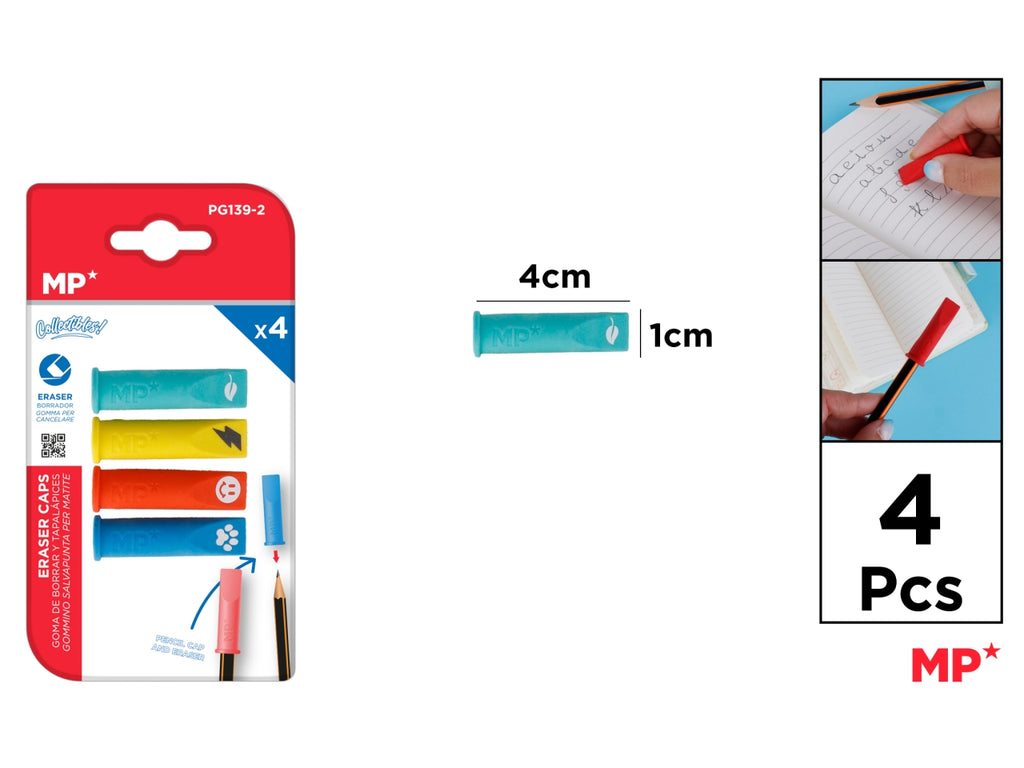 La gomma adattabile alla matita MP è un pratico cappuccio per gomma, progettato per adattarsi perfettamente all'estremità di una matita, garantendo un utilizzo comodo e immediato. Il set include 4 gomme in colori fluorescenti assortiti, ideali per aggiungere un tocco vivace al materiale scolastico o da ufficio. Con dimensioni di 40Ã12 mm e uno spessore di 5 mm, ogni gomma è ergonomica e maneggevole. Il design presenta un logo incassato inciso direttamente sul prodotto, mentre la parte superiore è decorata con una stampa personalizzata fornita dallâazienda. Il set è confezionato con 4 gomme di colori misti, offrendo una varietà estetica e funzionale perfetta per la scuola, lâufficio o lâuso quotidiano.