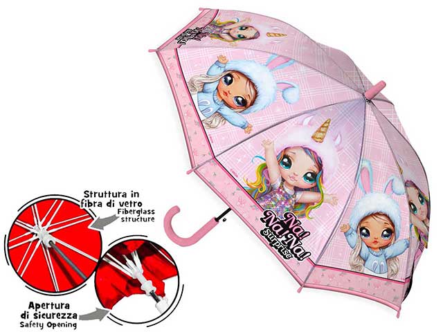 Ombrello in poliestere per bambina na! na! na! è perfetto per le giornate di pioggia. l'ombrello è ad uso riservato per bimbi e bimbe e infatti è di piccole dimensioni, leggero e facile da impugnare e maneggiare. l'intelaiatura è in fibra di vetro, con un'apertura di sicurezza che si blocca per tenere l'ombrello aperto e per evitare che si chiuda di scatto. l'ombrellino è pieghevole e assume dimensioni ridotte cosi da poterlo facilmente riporre in borsa. sulla tela a sfondo rosa sono raffigurati i personaggi. una bambolina na na na che farà  felice la vostra bimba.