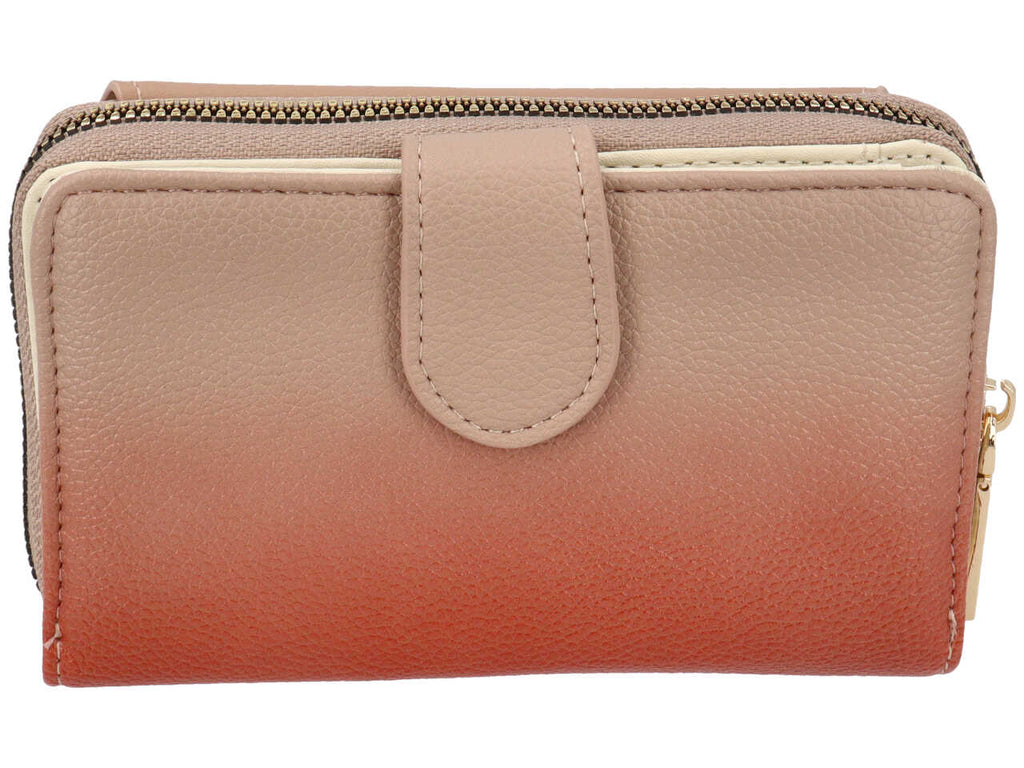 Portafoglio in similpelle con zip, interno suddiviso in 2 scompartimenti ,taschino portamonete con zip. Inserto con chiusura a bottone a clips, con scomparto portabanconote, 1 taschino trasparente portadocumenti e 5 scomparti per carte. Dispone di tasca con chiusura a pattina e clips