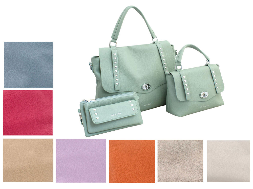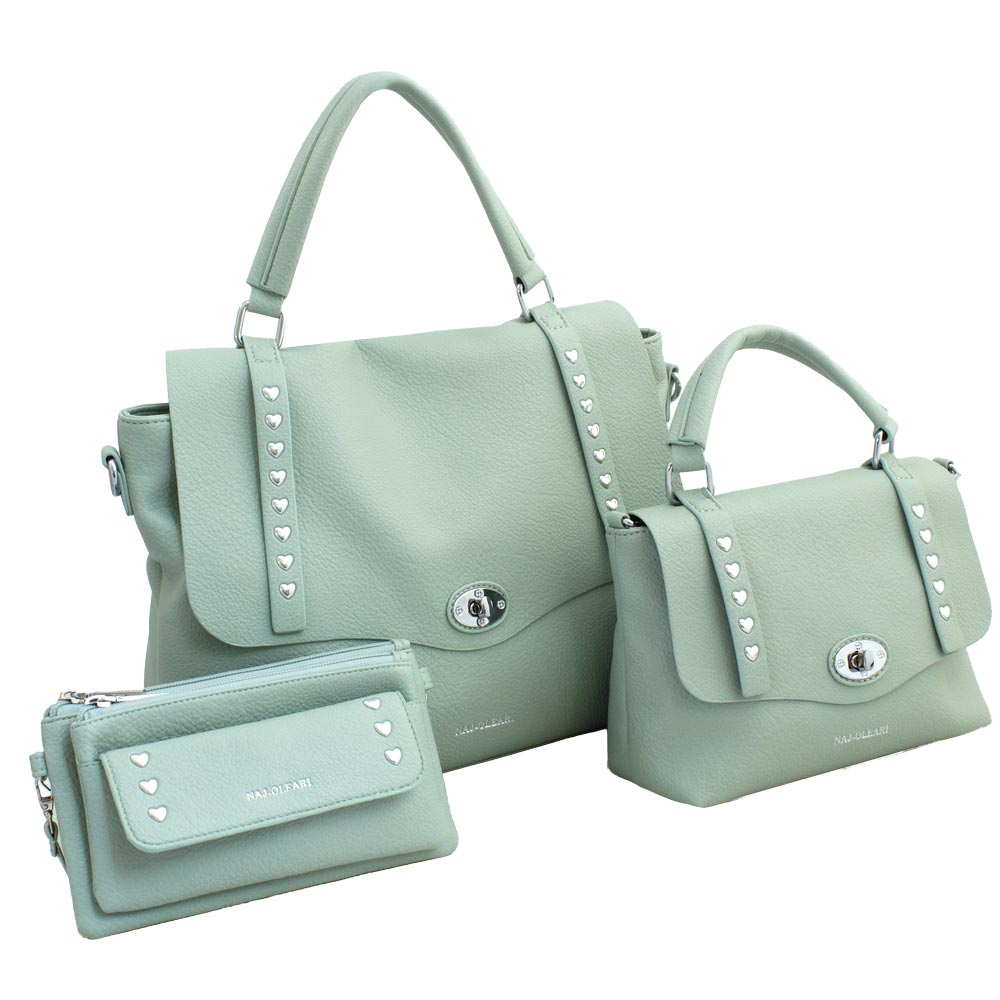 Questo set di Naj Oleari comprende tre misure di borse, tutte accessoriate di tracolla amovibile. La borsa a mano grande è dotata di chiusura interna a zip e una pattina frontale con chiusura in metallo girevole. La parte interna è rivestita in tessuto e presenta 3 tasche interne. La borsa media ha le stesse caratteristiche della grande, con una sola tasca interna. La borsa piccola è composta da due scomparti cuciti tra loro, entrambi con chiusura a zip indipendenti e taschino anteriore a pattina magnetica.