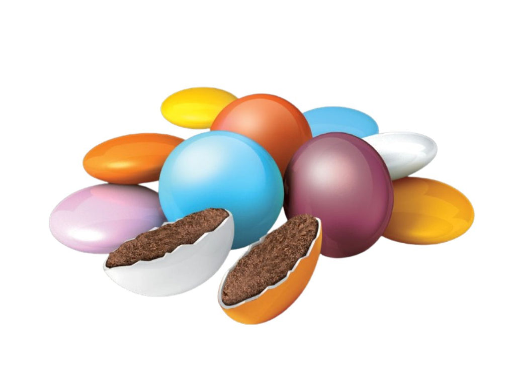 Ingredienti: Cioccolato al LATTE (50%) (zucchero, burro di cacao, LATTE intero in polvere, massa di cacao, siero di LATTE in polvere, emulsionante: lecitina di SOIA, aromi: vanillina. (Cacao min 28%); zucchero; amido di riso e di mais; gelificanti: maltodestrina, gomma arabica; estratto di Cartamo; coloranti: Curcumina - Riboflavine - Carminio - Blu