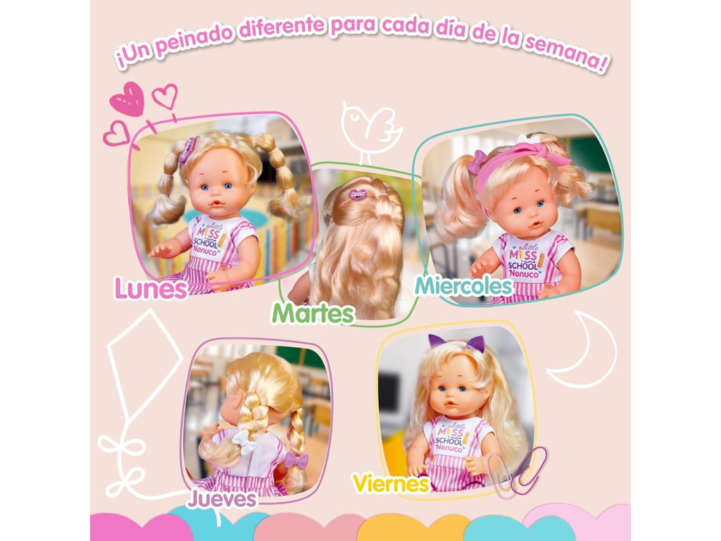Nenuco School Hairstyle è una bambola di 35 cm con corpo rigido e lunghi capelli biondi, perfetti per essere acconciati. I bambini possono creare nuove acconciature per Nenuco, una diversa per ogni giorno di scuola. Indossa un vestitino rosa a righe e una fascia per capelli abbinata. Sarà possibile utilizzare l'asciugacapelli, lâarriccia trecce, elastici, bigodini, spazzola, pettine e cerchietto per creare ogni giorno acconciature uniche e divertenti. Con questa bambola i bambini di età superiore ai 3 anni potranno migliorare la. manualità , le loro capacità creative e di coordinazione.
