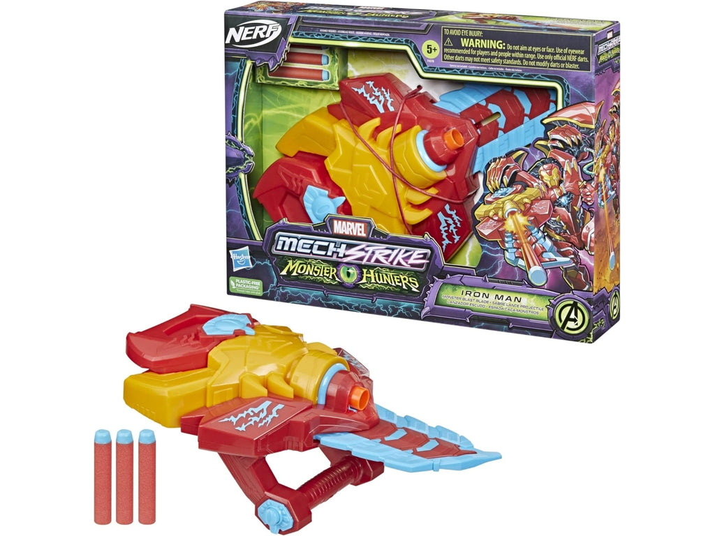Iron Man si prepara in un enorme costume mech bio-biologico per combattere i cattivi mostruosi, armati della sua lama Monster Blast. Lama a discesa: tira indietro l'icona dell'occhio mostro per attivare la lama pop-up, quindi premi il pulsante sulla maniglia per sparare un dardo Nerf per azione di esplosione mostro. I bambini dai 5 anni in poi possono immaginare versioni mostruose di cattivi Marvel con questo giocattolo di ruolo Monster Hunters, ispirato all'universo Marvel.