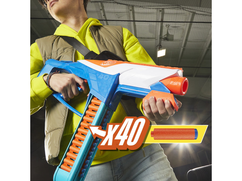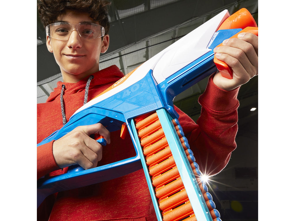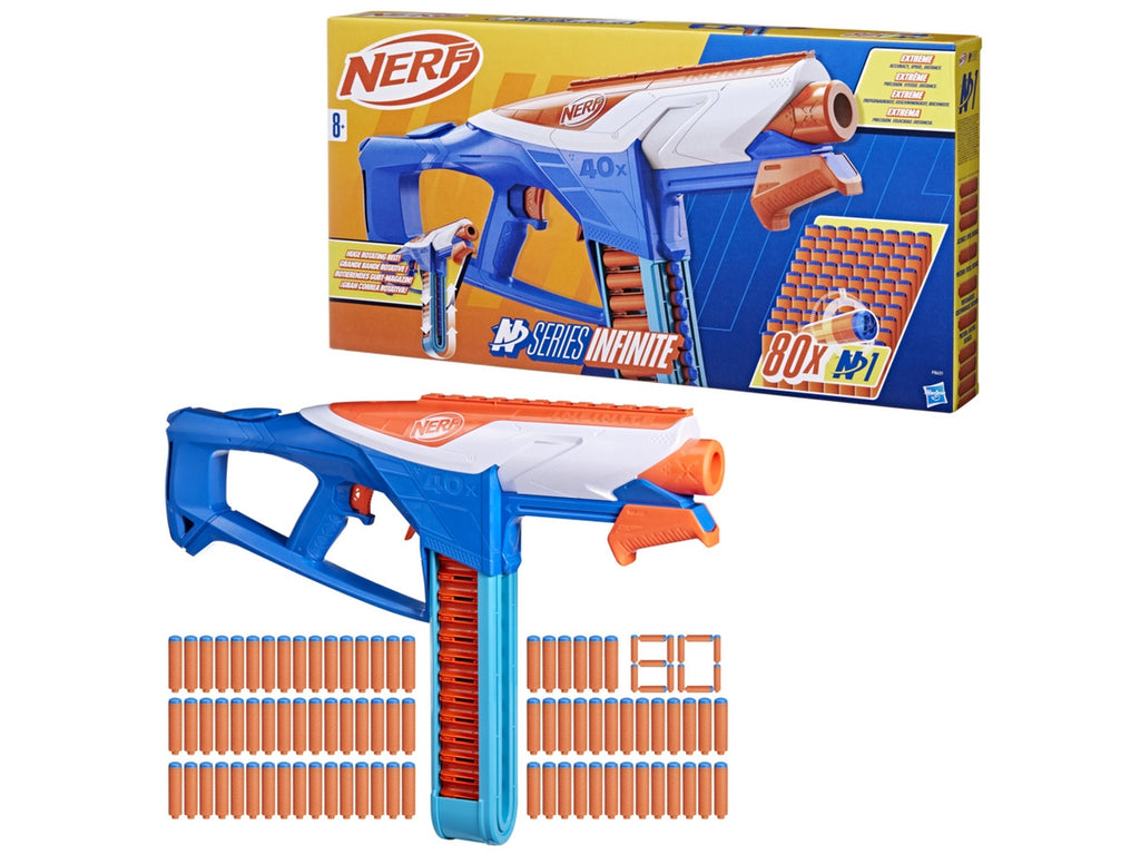 Nerf porta la sfida a un livello superiore con i nuovi blaster ad alte prestazioni Nerf N-Series e i dardi Nerf N1! Se già hai le capacità di un giocatore provetto, ora avrai anche a disposizione i blaster e dardi migliori di sempre, per vincere ogni tua sfida. Il blaster Infinite con dardi Nerf N-Series è dotato di un'innovativa catena da battaglia che ti consente di ricaricare i dardi velocemente e facilmente mentre stai giocando! Non dovrai più interrompere le battaglie per ricaricare! La catena rimovibile ha una capacità di 40 dardi grazie alla quale potrai sbizzarrirti a inondare il campo di gioco di dardi. Il blaster Infinite con azione a pompa include 80 dardi Nerf N1 in gommapiuma e dispone di un portadardi integrato da 16 dardi. Per giocare, carica i dardi all'interno della catena, tira indietro l'impugnatura di armamento e poi spingila in avanti e infine premi il grilletto per lanciare un dardo. I blaster Nerf N-Series sono compatibili esclusivamente con i dardi Nerf N-Series N1. Si raccomanda di indossare un paio di occhiali protettivi (non inclusi).