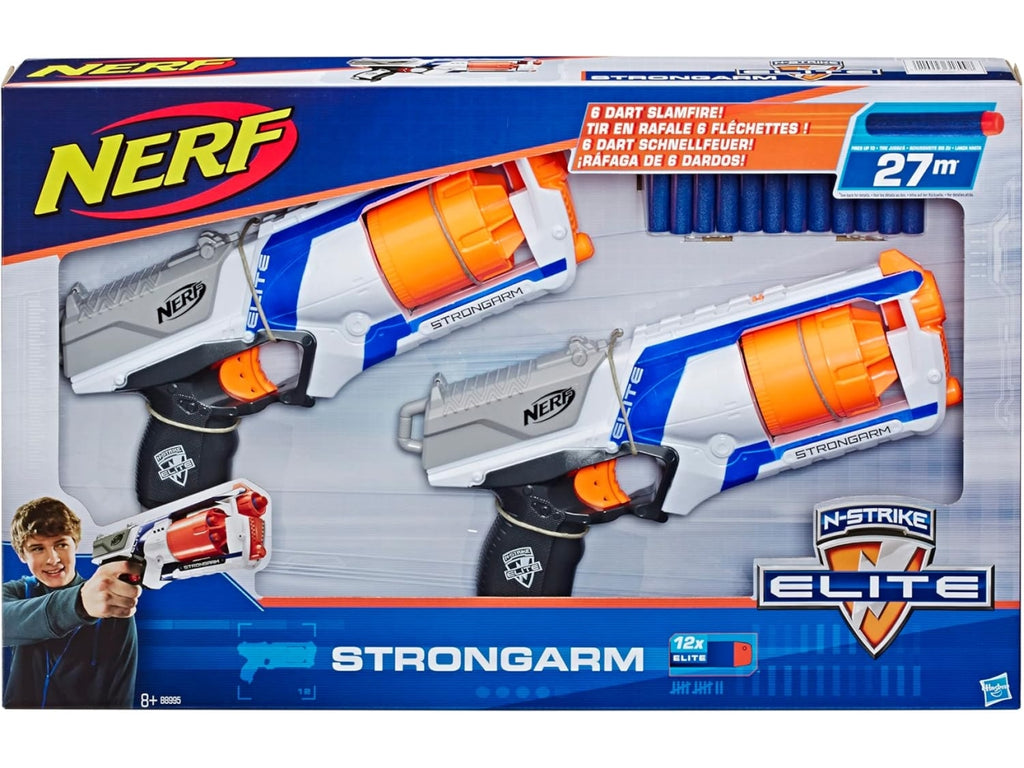 La confezione include due blaster NERF Strongarm della serie Elite, ciascuno con un tamburo da sei colpi e dardi originali NERF compatibili. È l’ideale per duelli uno contro uno, sfide in famiglia o tra amici, sia all’aperto che in ambienti interni.