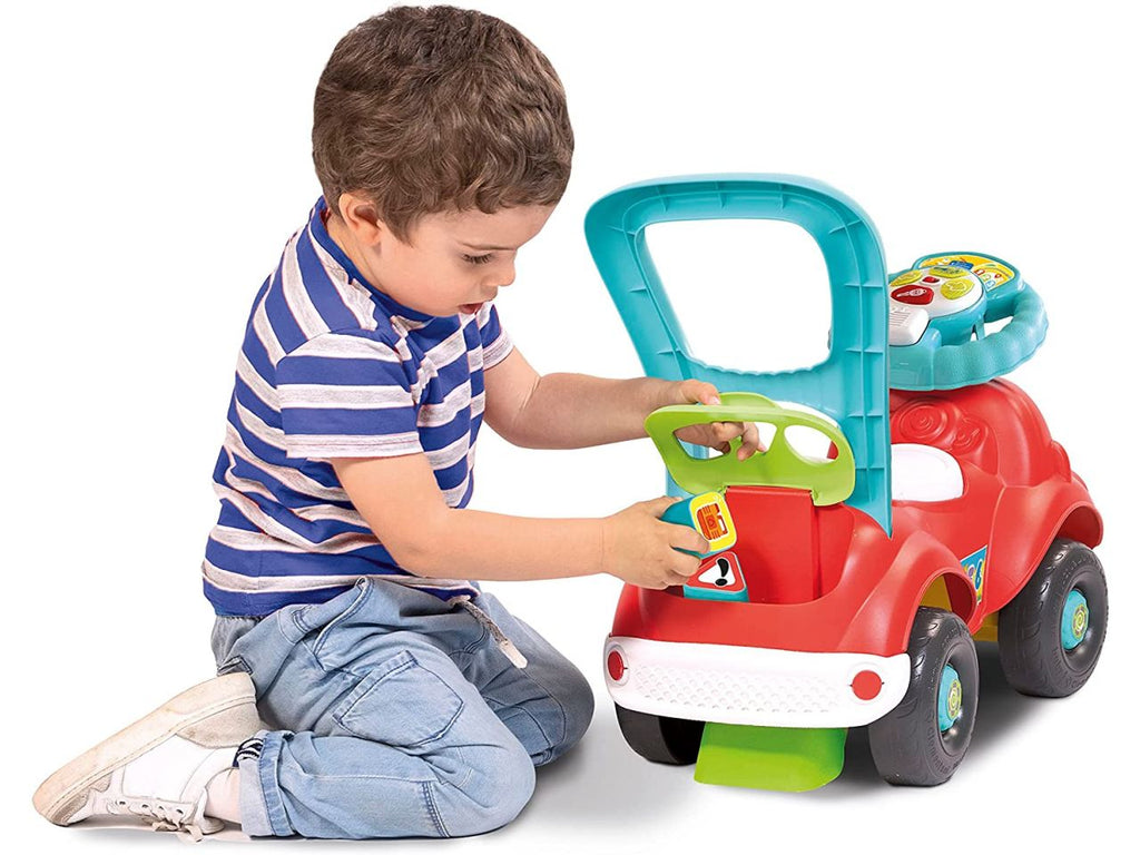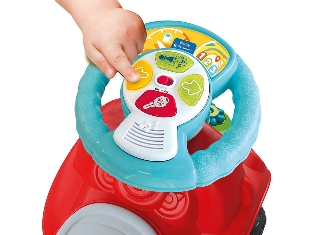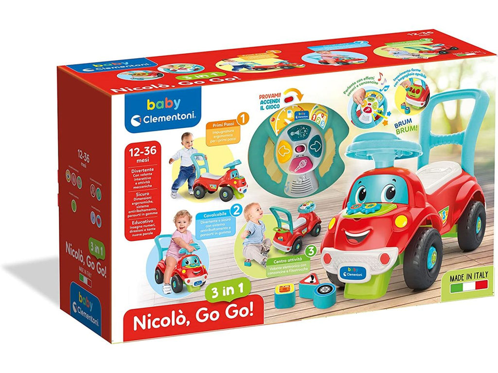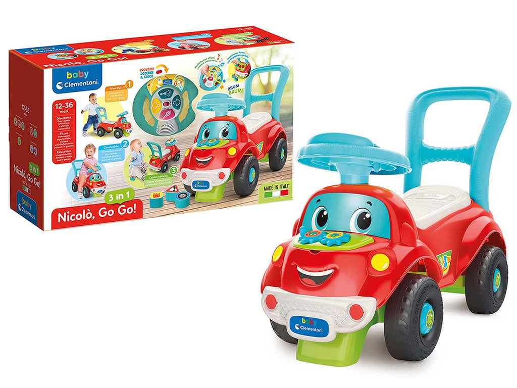 Clementoni- nicolò go 3 in 1-macchinina cavalcabile, elettronico educativo parlante, primi passi, luci e suoni, gioco bambini 1 anno-made in italy, multicolore.nicolà go go 3 in 1: una macchinina dal design unico con 3 diverse funzioni: cavalcabile, primi passi e centro attività macchina cavalcabile: questo cavalcabile è studiato fin nei minimi dettagli, con ruote sterzanti, sistemi antiribaltamento e paraurti in gomma morbida per risultare ergonomico, sicuro e confortevoleelettronico luci e suoni: il volante elettronico con tanti suoni e canzoni, cattura l'attenzione del bambino e ne stimola la curiosità e l'udito. premendo la chiave si attiva la modalità con effetti sonori realistici, per stimolare limmaginazione e il gioco imitativoattività meccaniche: gli ingranaggi da girare per "riparare il motore" e le formine da inserire e recuperare dal bagagliaio, supportano lo sviluppo psicomotorio del bambinocaratteristiche: gioco bambini 1 anno made in italy con batterie incluse Un'auto dal design unico con 3 diverse funzioni: cavalcabile, primi passi e centro attività.