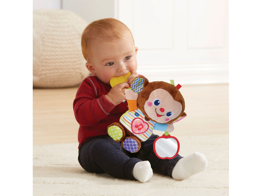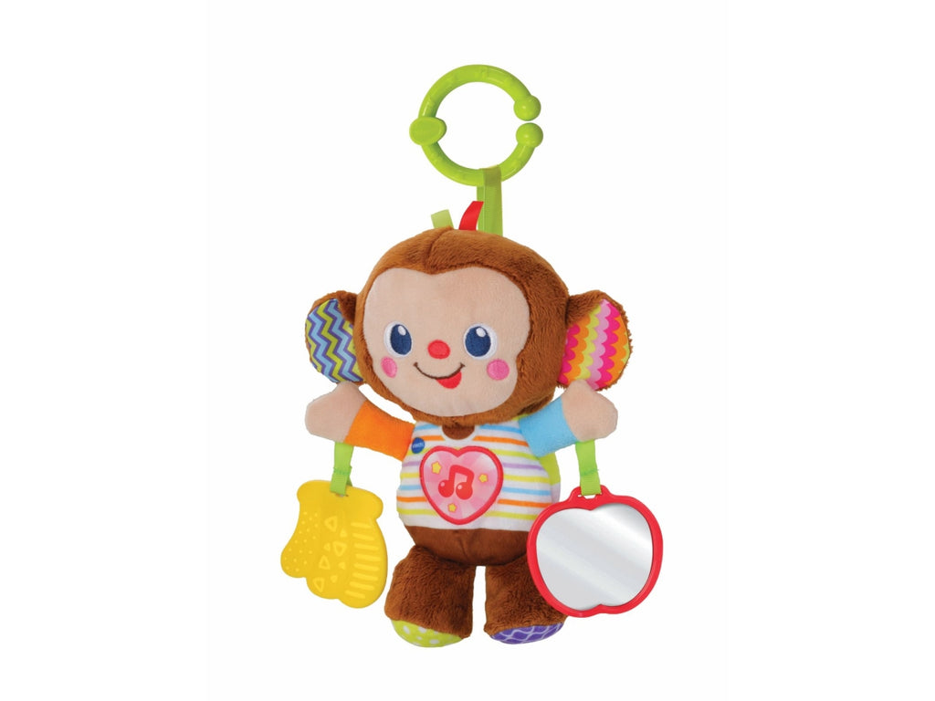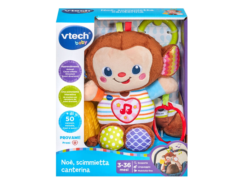 La scimmietta canterina grazie al sensore di movimento integrato, la scimmietta parla e riproduce dei suoni divertenti. Un cuore luminoso da premere per ascoltare diverse frasi e delle simpatiche melodie. Uno specchietto a forma di mela per incoraggiare la scoperta di sé. Un sonaglino massaggiagengive per alleviare il momento della dentizione del tuo bambino. Un anello per poter attaccare la scimmietta ovunque e portarla sempre con sé! Più di 50 canzoni, melodie, frasi e suoni. Regolazione del volume e spegnimento automatico. 3 canzoni e 15 melodie. Scatola Try Me