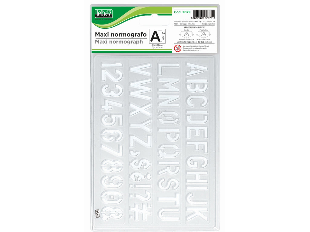 Maxi normografo in plastica trasparente con carattere bastone. Altezza caratteri 2 cm. Strumento per il disegno tecnico, utilizzato per la scrittura di caratteri uniformi con intagliate lettere e numeri.