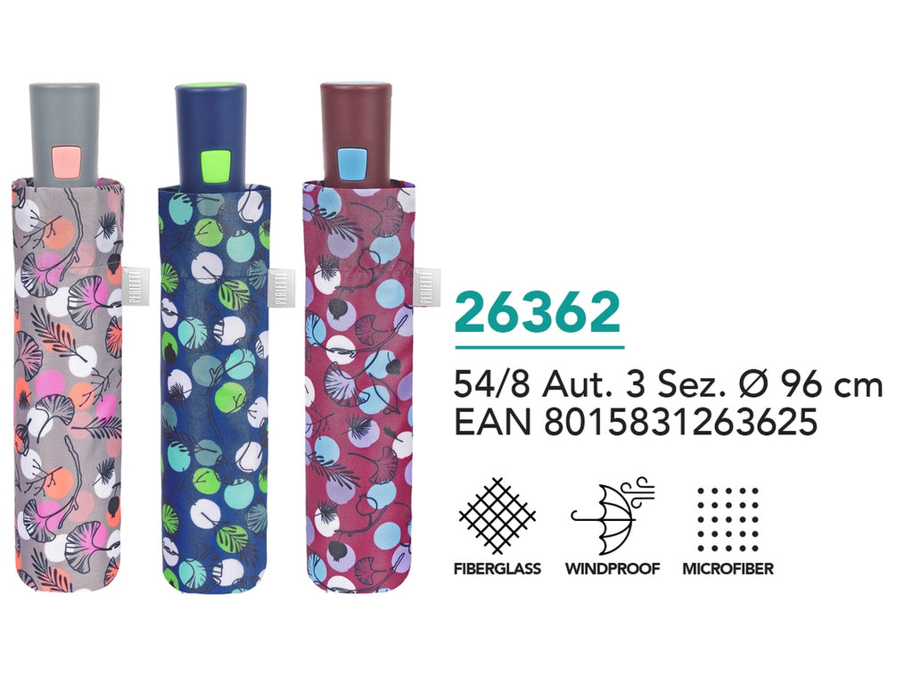 Fantasie colorate e vivaci per illuminare le giornate grigie! La trama floreale è ciò che contraddistingue questo ombrellino pensato per chi è alla ricerca di un accessorio femminile e originale da portare con sé tutti i giorni. Questo ombrello pieghevole della collezione Perletti Time è leggero e pratico da portare in uno zaino o una borsa. Struttura antivento compatta e resistente grazie a innovative bacchette in fibra di vetro che garantiscono leggerezza e flessibilità all'ombrello anche in presenza delle raffiche di vento più forti. Tessuto in microfibra che garantisce un'asciugatura super rapida ed è totalmente privo di sostanze tossiche. Accessorio da pioggia a tre sezioni con apertura automatica.
