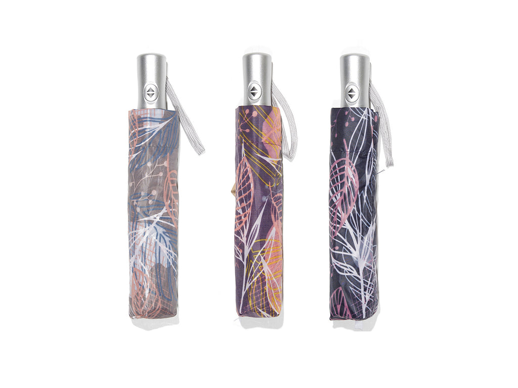 Ombrello pieghevole automatico A&C, assortito in 3 varianti fantasia donna con impugnatura in plastica argento.