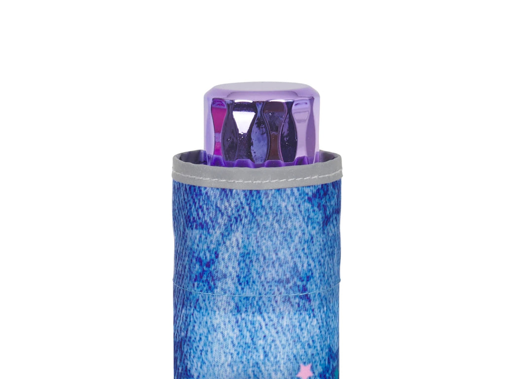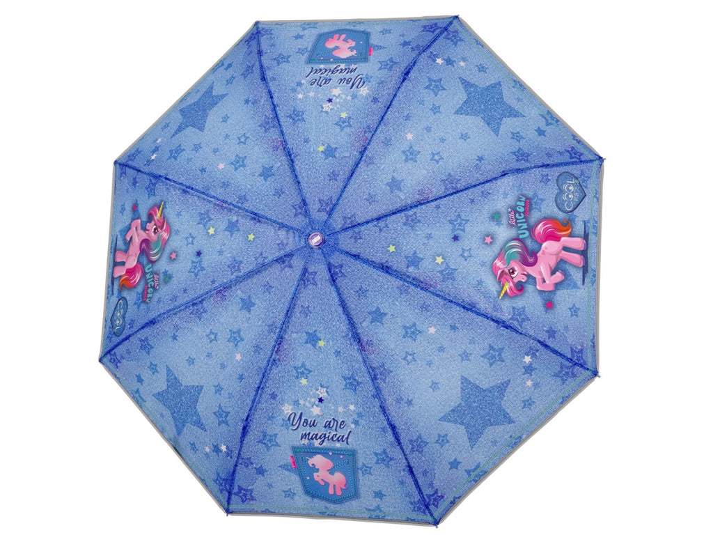 Entra nel mondo onirico degli unicorni passeggiando sotto la pioggia con questo ombrellino originale. Lo sfondo denim e la stampa di un un unicorno rosa lo rendono un accessorio di tendenza e alla moda. Eâ perfetto per le bambine a partire dai 7 anni, ed è facilmente trasportabile in una borsa o in uno zainetto. I suoi profili catarifrangenti permettono unâalta visibilità anche nelle giornate più buie e garantiscono la massima sicurezza. La struttura composta da innovative bacchette in fibra di vetro assicura un'ottima resistenza alle raffiche di vento più forti. L'apertura è manuale e facilitata grazie al pratico sistema salva-dito con puntine arrotondate e fissate a prova di bambino. Il regalo che cercavi da sempre!