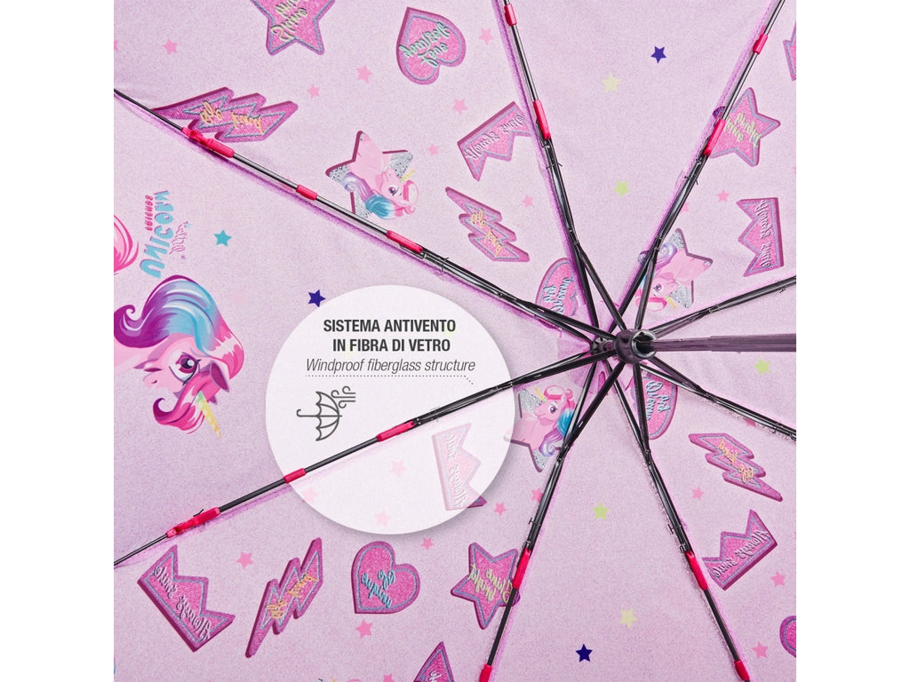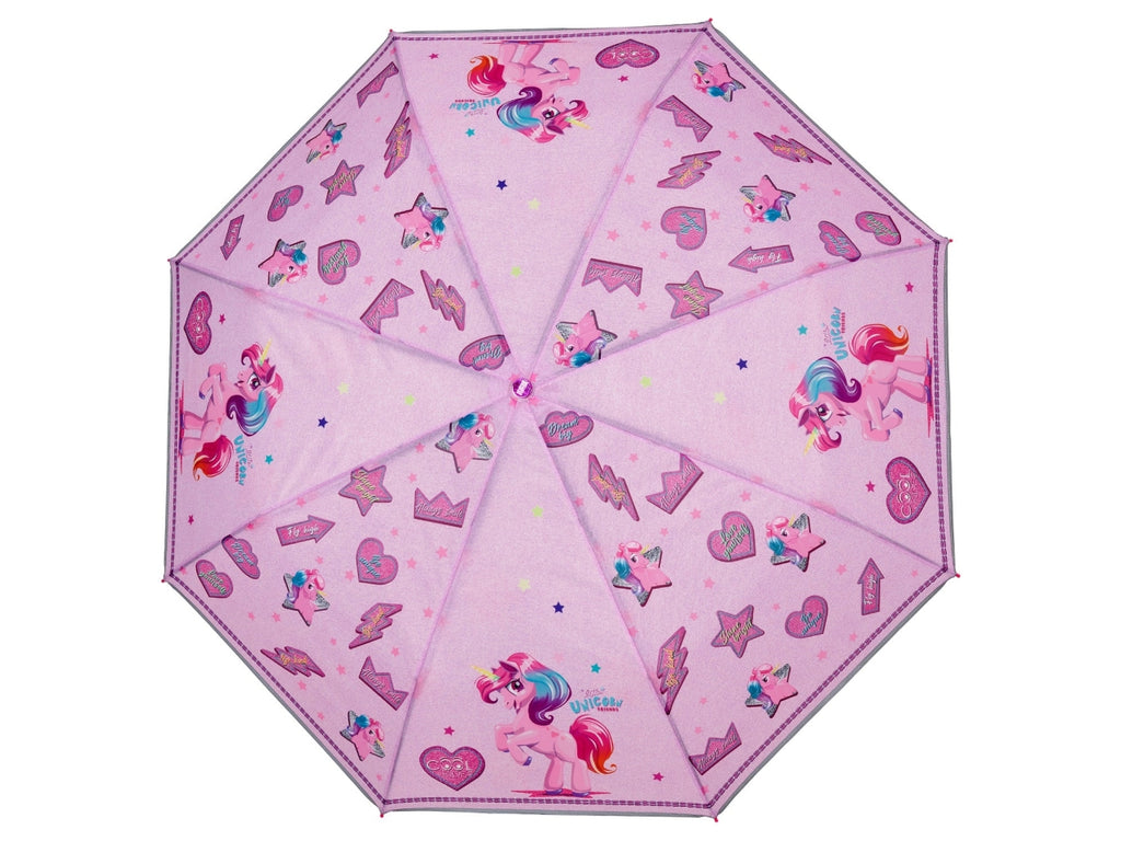 L'ombrellino pieghevole a tema unicorno è un accessorio romantico e dai colori vivaci e femminili. Le bimbe non potranno che innamorarsene! La stampa in primo piano di un unicorno rosa circondato da cuoricini, stelline e coroncine lo rende unico: lâaccessorio perfetto per le amanti degli unicorni. Il bordo catarifrangente riflette la luce e permette di essere visibili anche in condizioni di scarsa visibilità garantendo la massima sicurezza. Le bacchette in fibra di vetro garantiscono un'ottima resistenza al vento. Lâapertura manuale è facilitata grazie al pratico sistema salva-dito e le puntine sono arrotondate e fissate, a prova di bambino.