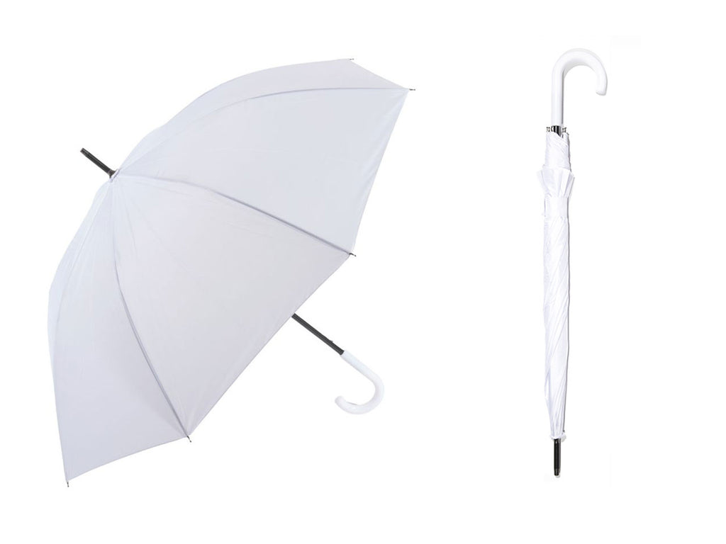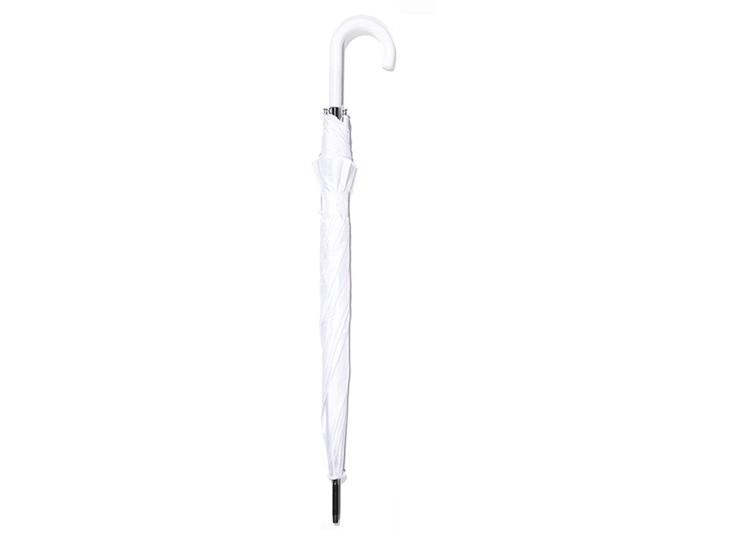 Ombrello bianco con apertura automatica. La struttura e le bacchette sono realizzate in fibra di vetro, con un'impugnatura curva. Il tessuto dell'ombrello è in pongee, un tipo di tessuto leggero e resistente.