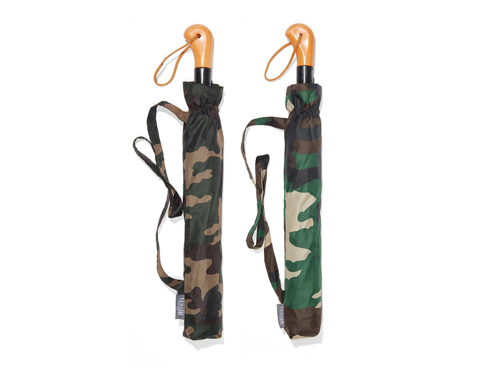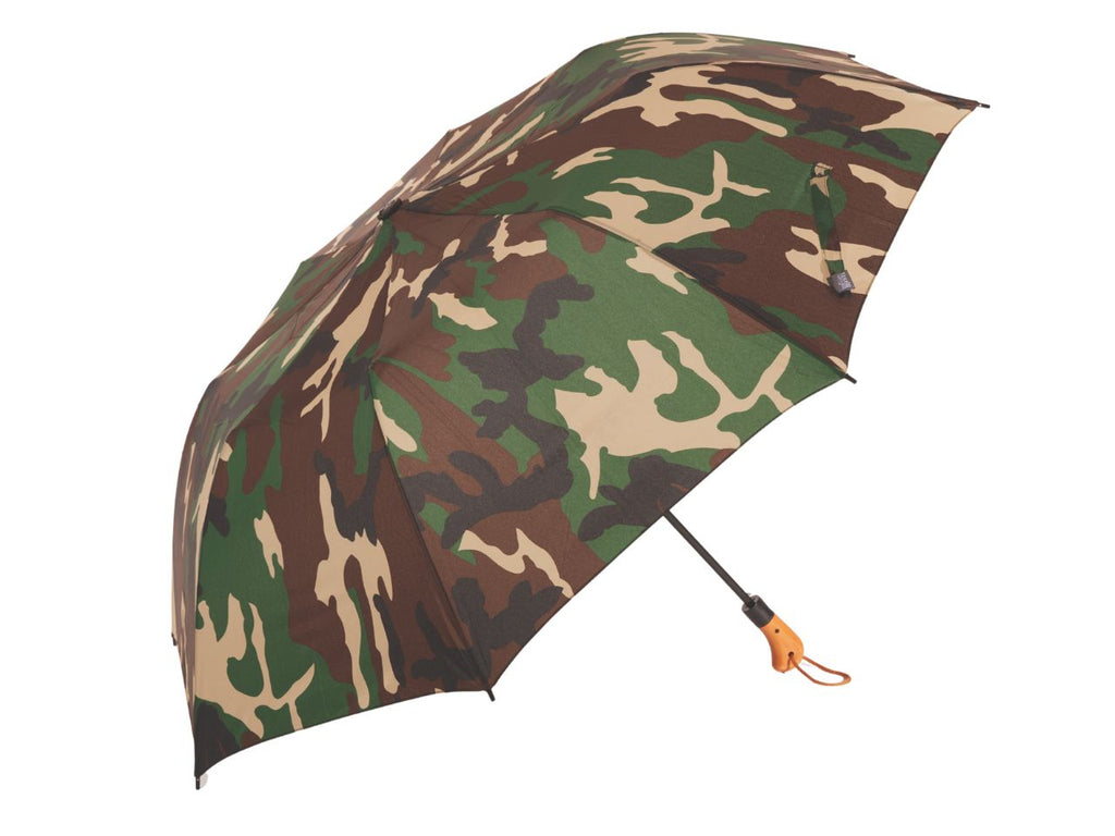 Ombrello Golf pieghevole, con apertura automatica in due sezioni, con aste in fibra di vetro, realizzato in tessuto pongee camouflage corredato di fodero con tracollina e manico di colore legno.