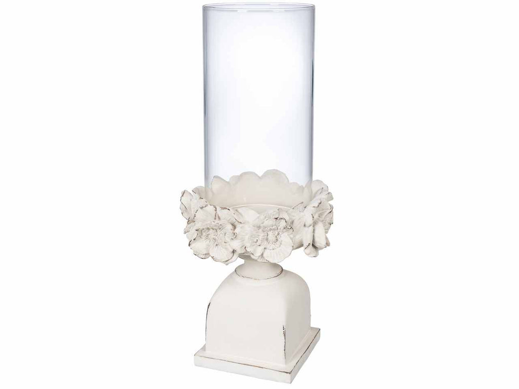 Porta candele in poliresina, colore bianco decapato, vetro staccato dalla base, misura articolo: d.14xh.33cm; vetro: d.10xh.20cm