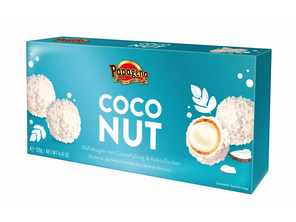 Le palline di waffle al cocco di Papagena sono per momenti di coccola speciali e il loro delizioso sapore ti porterà su una spiaggia tropicale con il rumore del mare. Piacere perfetto per l'estate.
