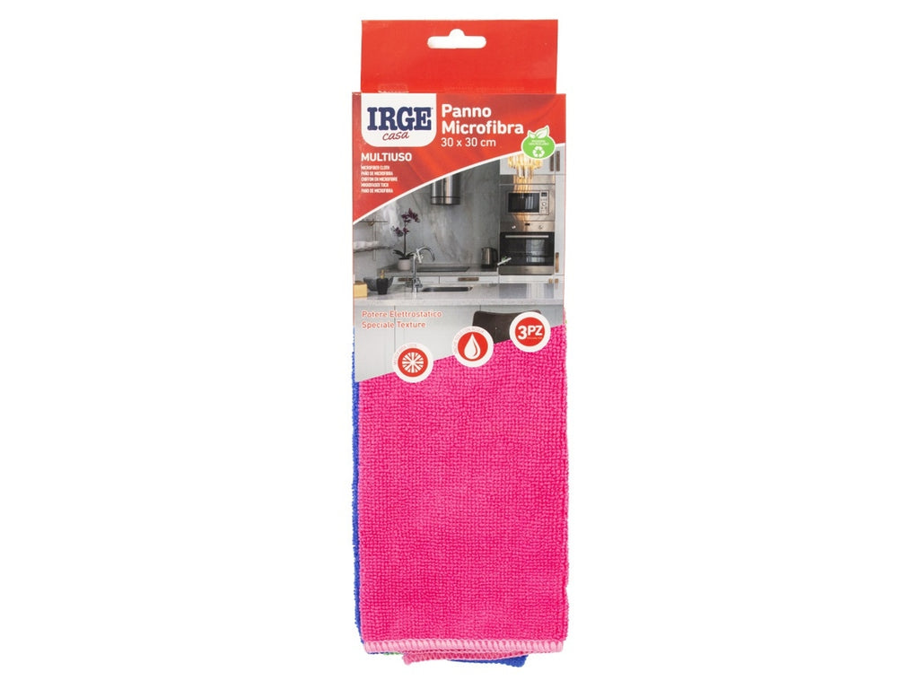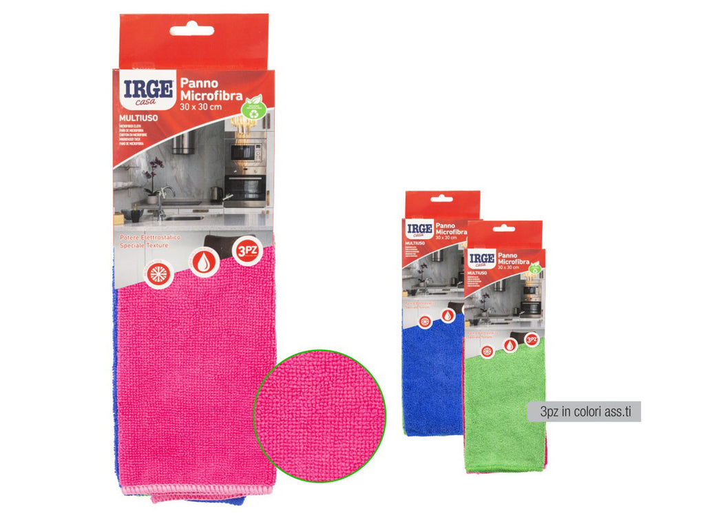 Panno 100% microfibra irge3 pz 30x30 cm. adatto a tutte le superfici, deterge e cattura la polvere. set da 3 pezzi assortito nei colori: verde, grigio e viola.