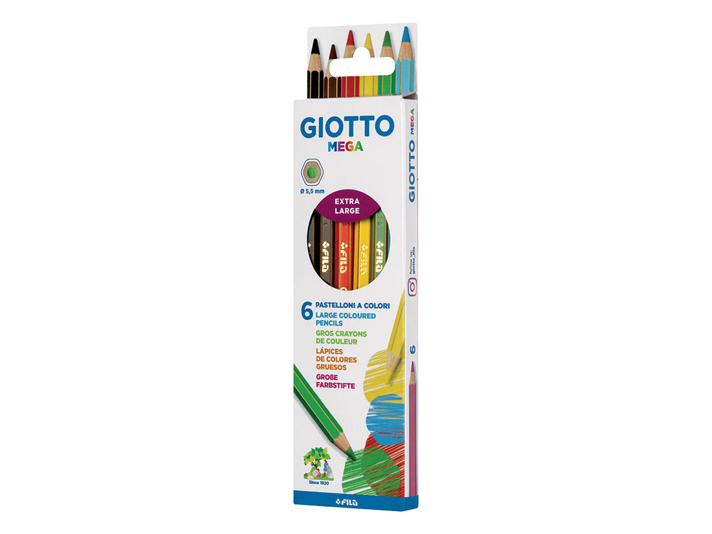 Pastellone gigante sezione esagonale 9 mm, verniciato nel colore della mina con spigoli dorati. lunghezza 18 cm. mina gigante diametro 5,5 mm per una grande riserva di colore. in astuccio appendibile 6 pz colori classici. legno certificato.