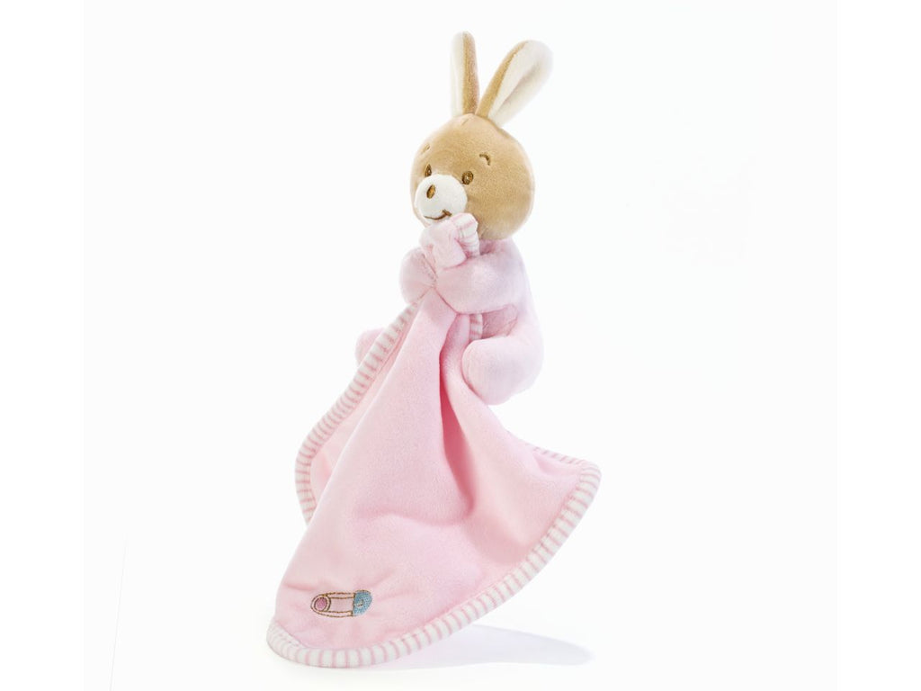 Doudou coniglietto peluche baby realizzato artigianalmente nel rispetto delle norme europe di sicurezza del giocattolo