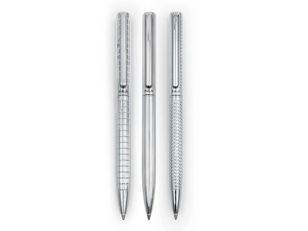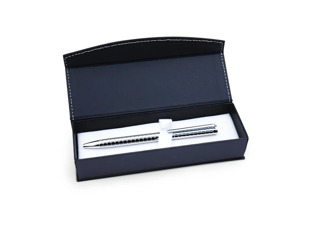 Penna a sfera Admiral in metallo cromato lucido, dalla linea elegante impreziosita da tre diverse finiture: Liscia, Quadri e Spirale.