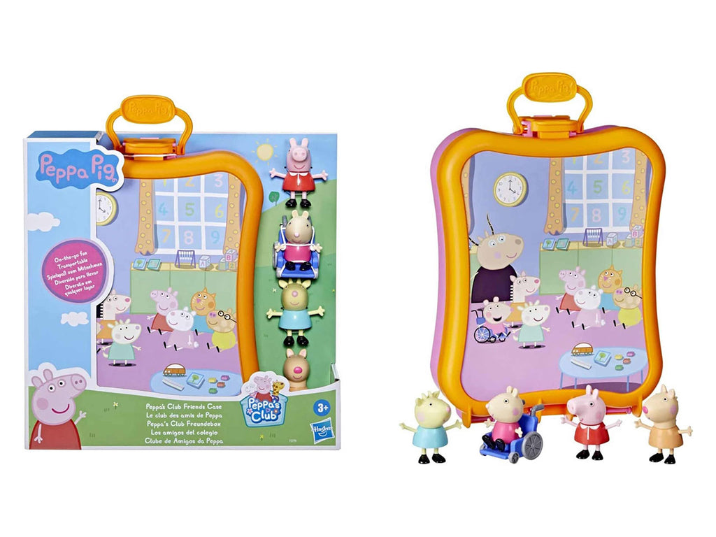 Con la scatola degli amici Peppa's Club, i bambini in età prescolare e i fan di Peppa possono pensare a partire dai 3 anni di avventure divertenti con Peppa Pig e tre dei loro amici del gruppo scolastico: Mandy Mouse, Lotte Lama e Barbarella Bock. Tutti e 4 i personaggi (compresa la sedia a rotelle Mandy) e altri si adattano perfettamente alla scatola e rendono facile riordinare e riporre.