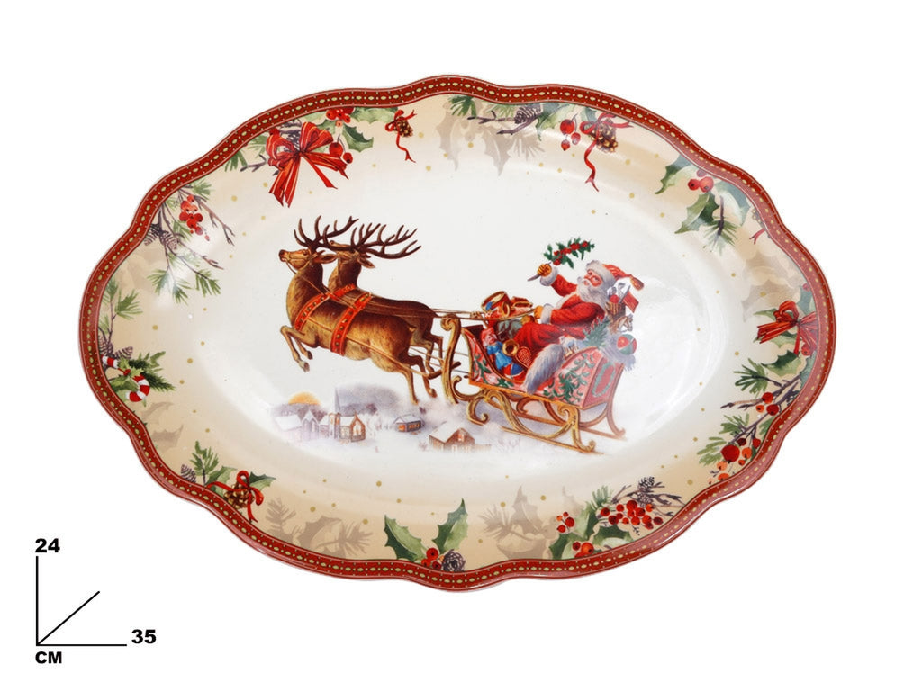 Il piatto ovale, lungo 35 cm e largo 24 cm. Presenta un design natalizio con Babbo Natale su una slitta trainata da renne, circondato da dettagli decorativi come bacche rosse, agrifoglio e fiocchi festivi. Il bordo ondulato del piatto è decorato con un motivo rosso e dorato, che aggiunge un tocco elegante e tradizionale. Questo piatto è ideale per servire pietanze durante le feste natalizie o per essere utilizzato come elemento decorativo centrale sulla tavola. Grazie al suo design festoso e ai dettagli raffinati, è perfetto per creare un'atmosfera accogliente e gioiosa durante il Natale.