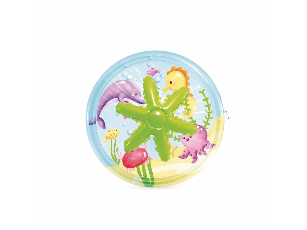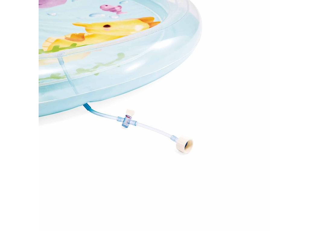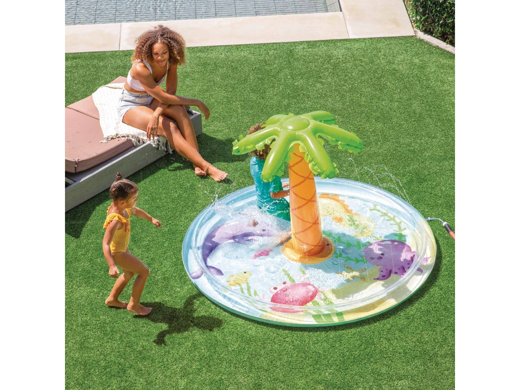 Porta il tuo bambino su un'isola tropicale piena di divertimento con la Piscina Palma. Questa piscina in vinile è dotata di una palma gonfiabile al centro, alta ben 104 cm! Collega il tubo da giardino all'anello gonfiabile di diametro 173 cm per rinfrescare la piscina con giocosi spruzzi d'acqua. La capacità d'acqua a 10 cm di riempimento è di 166 L. La confezione include una toppa di riparazione. Età : 2+ anni.