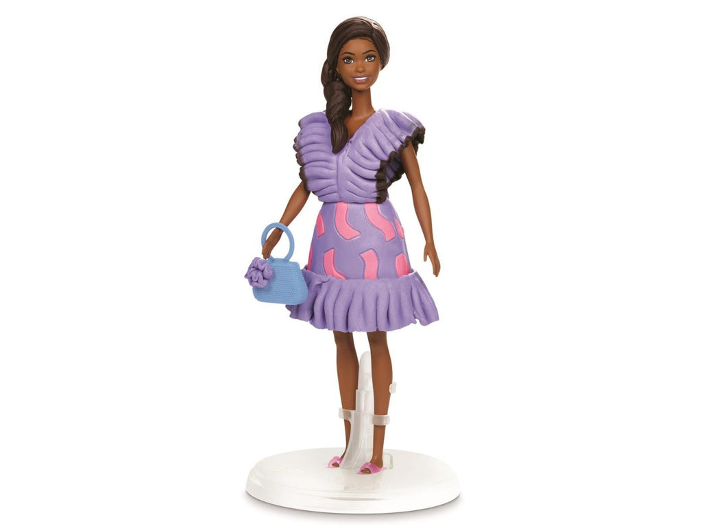 Scatena la tua creatività con il set Designer, dove potrai creare abiti unici per le bambole Barbie con il Play-Doh. Questo kit per il fai da te rende facile e divertente disegnare abiti per Barbie. Basta posizionare la bambola sul supporto, usare il foglio con il modello Play-Doh e le formine per creare abiti e vestirla con stili fantasiosi.