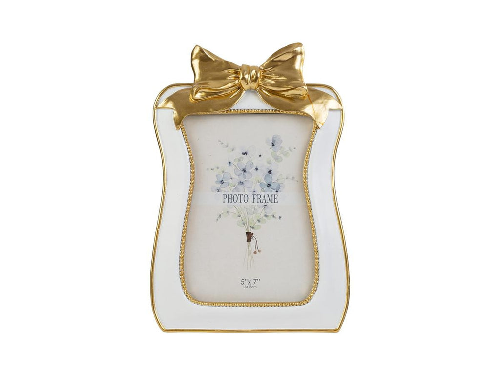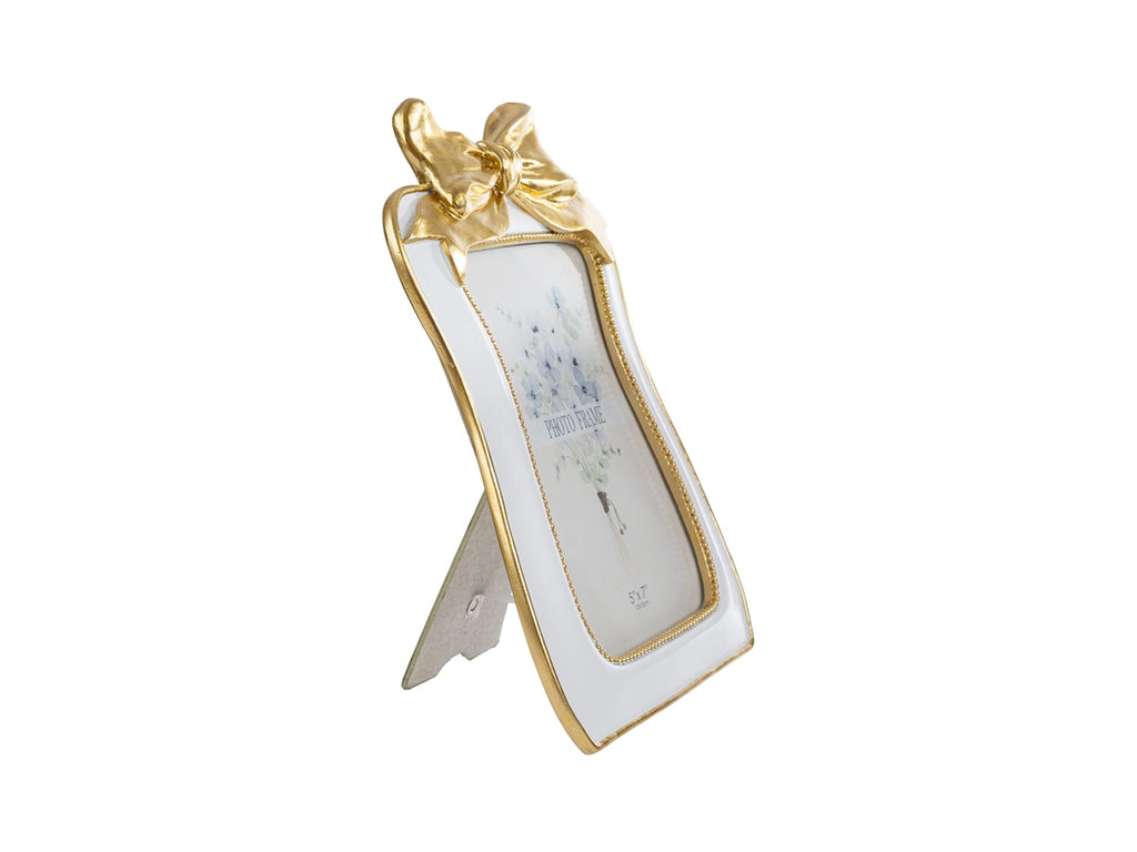 Portafoto resina bianco con fiocco oro 18x26cm esterno, 13x18cm interno