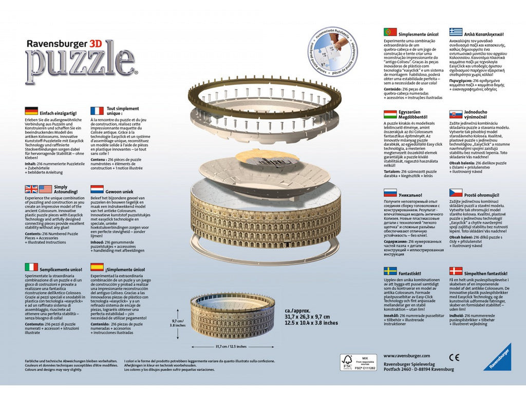 Una bellissima riproduzione in 3D del monumento piú famoso dell´Antica Roma: il grandioso Colosseo! Ravensburger è da sempre rinomata e apprezzata per la qualità dei suoi puzzle che da oggi potrai trovare anche in versione 3D! Colleziona meravigliose costruzioni di edifici particolari e dei monumenti più famosi al mondo! Si assemblano senza l'uso di colla, forbici o altri utensili, sono perfettamente stabili e rappresentano fedelmente in ogni singolo pezzo tutti i dettagli del soggetto!