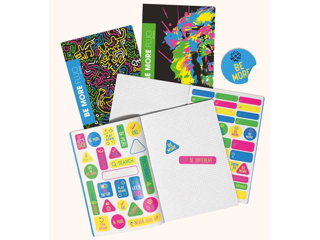 Maxi quaderni A4 realizzati con carta pregiata da 100 grammi, ideale per frequenti cancellature e per ogni tipologia di inchiostro. Copertina pesante da 250 g/m2 arricchita con lavorazioni speciali - plastica lucida e colori FLUO, per farti vivere delle esperienze sensoriali uniche! Interno copertina colorato e risguardo da colorare! Confezione da 10 pezzi, fantasie assortite! Made in Italy.