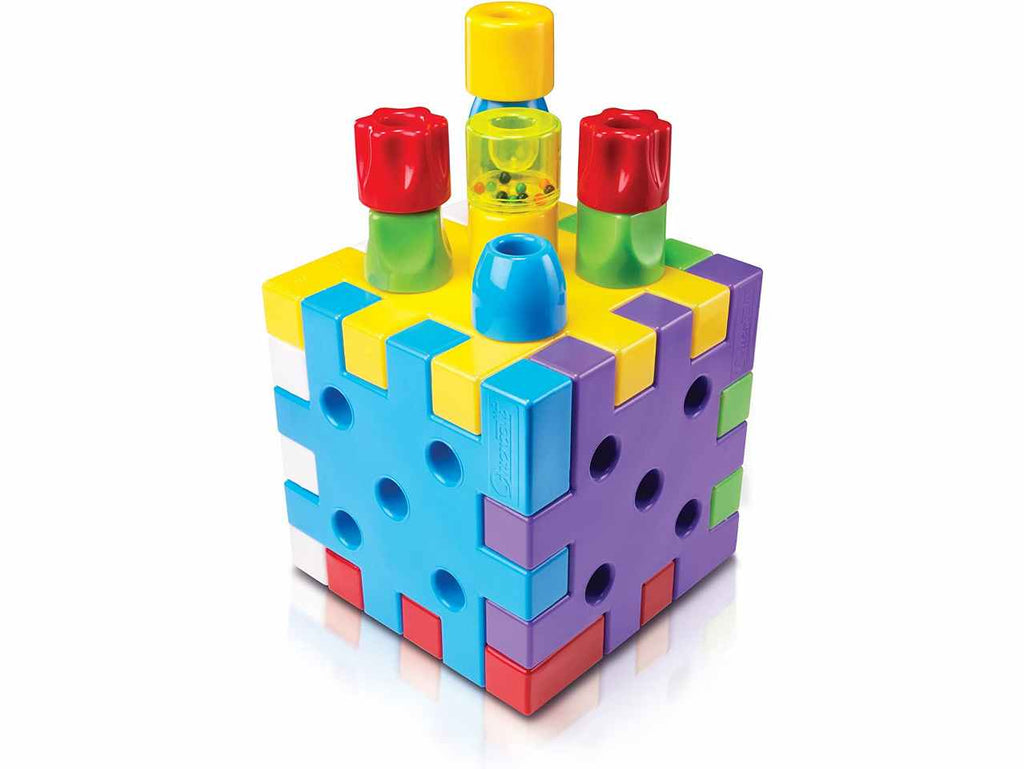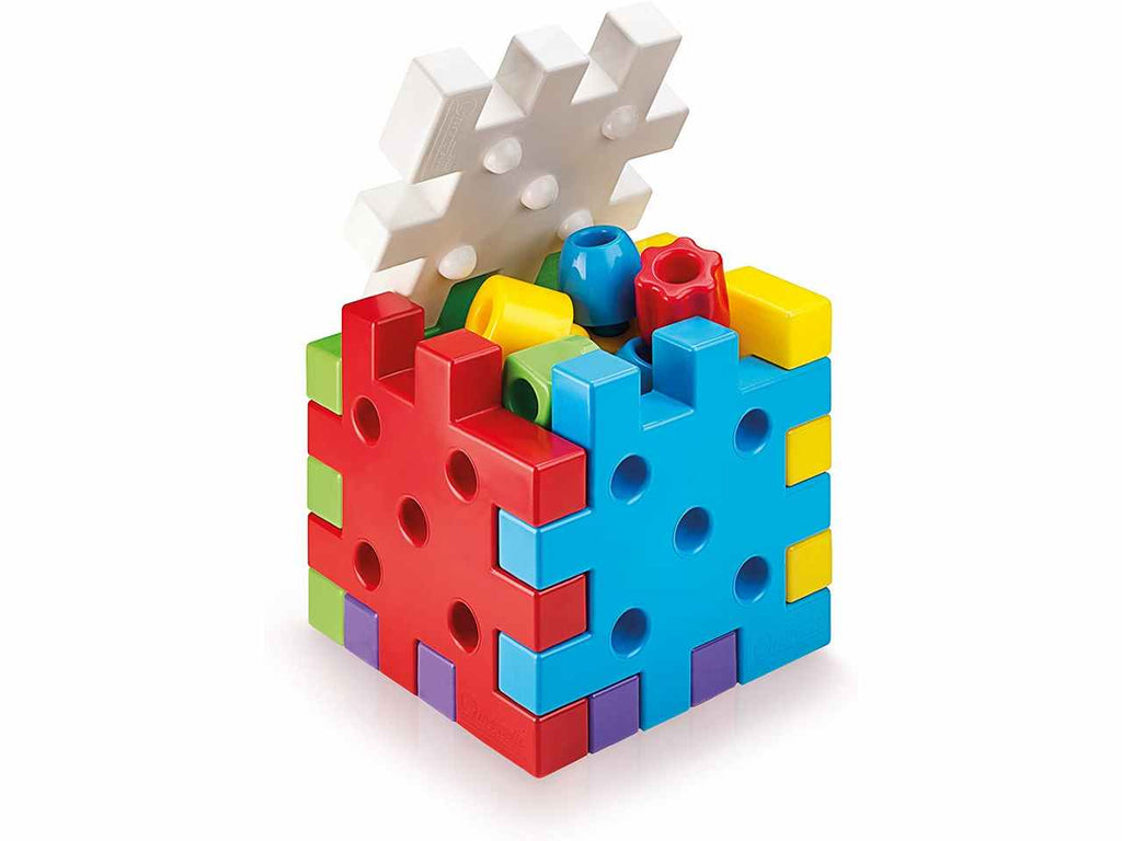 Qubò è un gioco di costruzioni per i più piccoli, composto da grandi piastre, da incastrare o sovrapporre, e da grandi chiodi in 4 forme da impilare in verticale, come fossero colonne, o da infilare nei "buchi" delle piastre in orizzontale. grazie al suo design accattivante, alle sue forme arrotondate ed ai materiali impiegati, morbidi e leggeri, sarà  facile e divertente giocare, in piena sicurezza, a costruire ardite torri o strutture sempre più alte ma in stabile equilibrio! le forme differenziate ed i colori primari e secondari stimolano la percezione visiva, la coordinazione occhio-mano e sviluppano efficacemente la destrezza manipolativa.