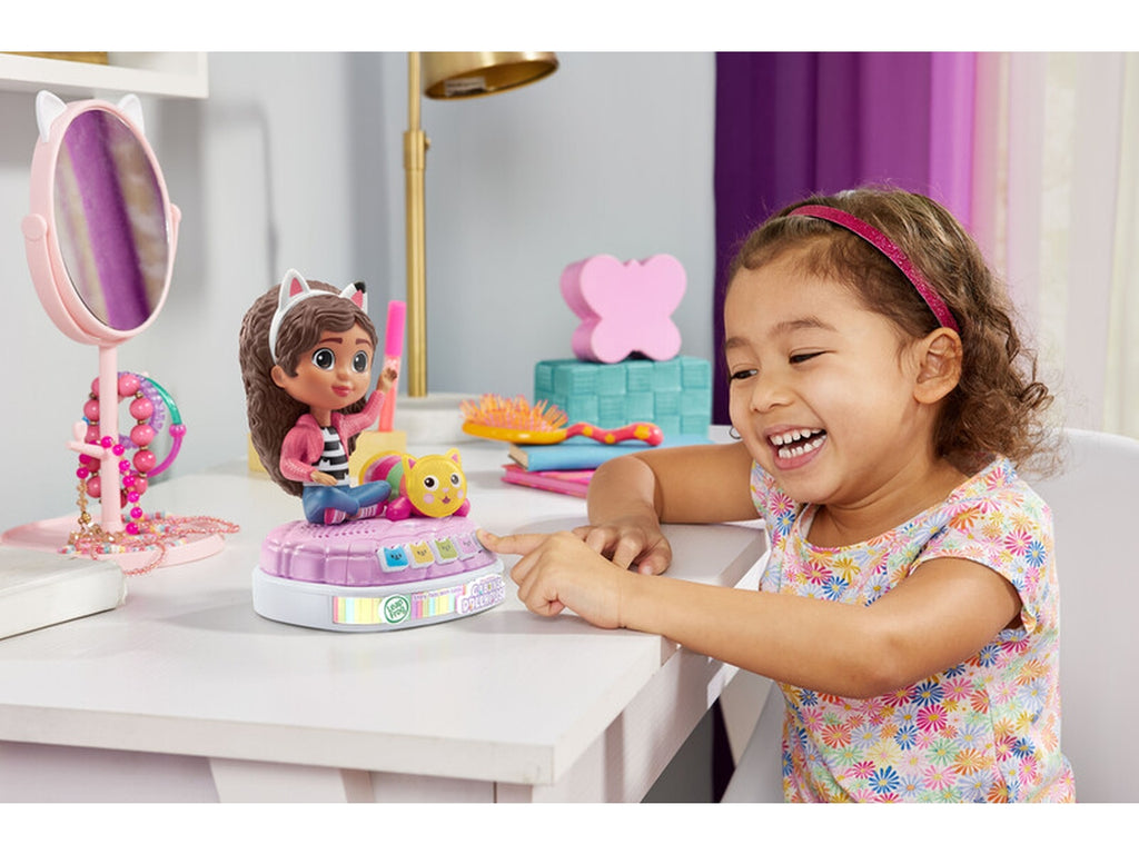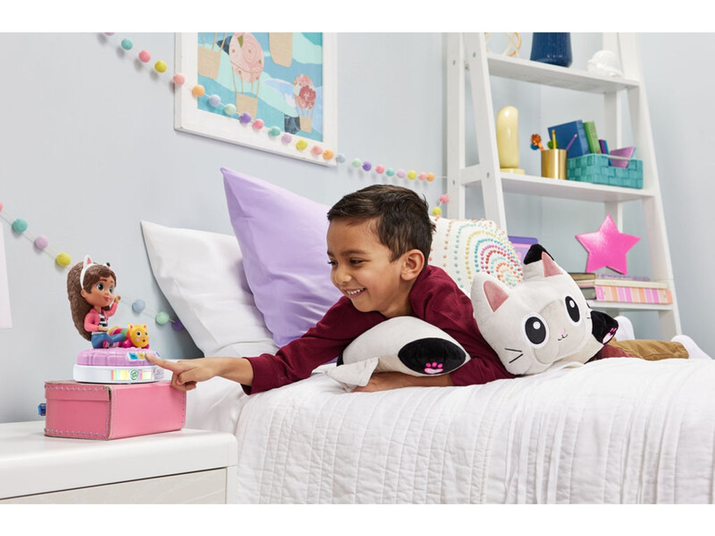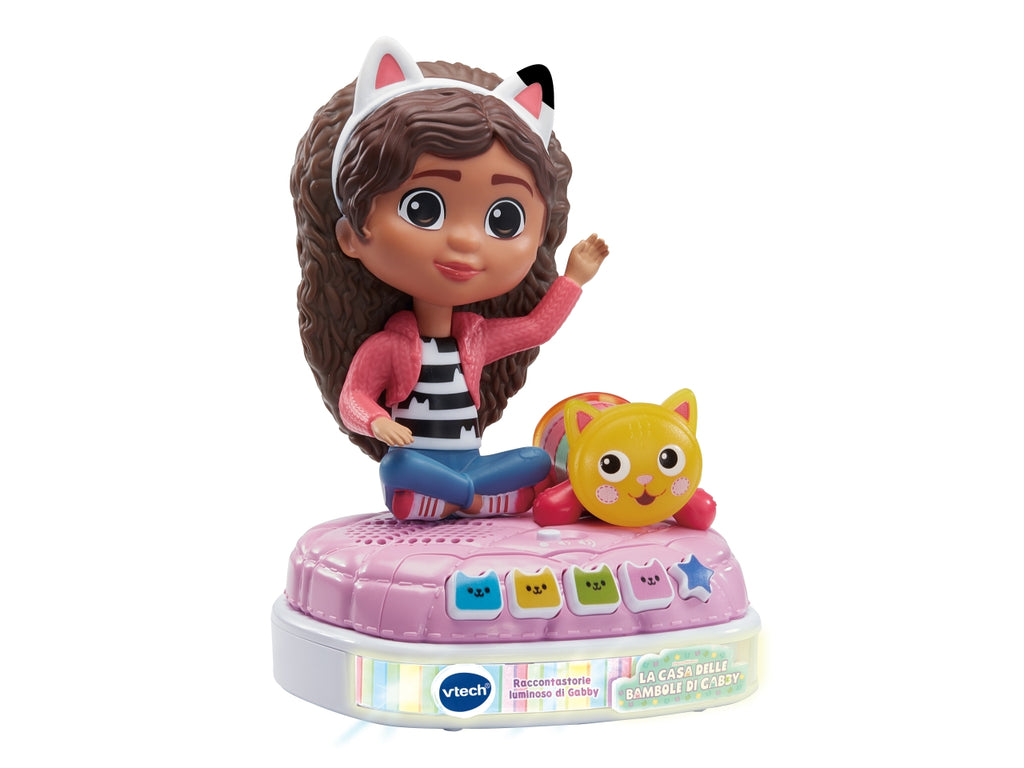 ⢠4 pulsanti interattivi per ascoltare 4 storie ispirate agli episodi della serie: âIl fusa dìâ, âAiuto Gabby! Si sono rimpiccioliti i gattiniâ, âAerei, treni e mongolfiereâ e âLâora della favola di Cuscigatta.â. ⢠Pulsante scoperte: per conoscere meglio i personaggi della serie e partire con loro per una delle 9 avventurose missioni! Accompagna Gabby e aiutala a trovare i Cricegatti o a imparare a fare trucchi di magia con Baby Scatola, oppure a fare delle rime con Cuscigatta e molto altro ancora! ⢠Cuscigatta e la base si illuminano con tanti effetti luminosi! Il raccontastorie diventa anche luce notturna per accompagnare i bimbi durante la nanna. ⢠Divertentissimi suoni direttamente dalla serie! ⢠Spegnimento automatico e regolazione del volume.