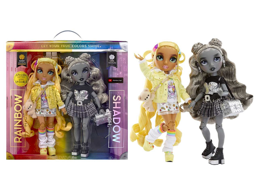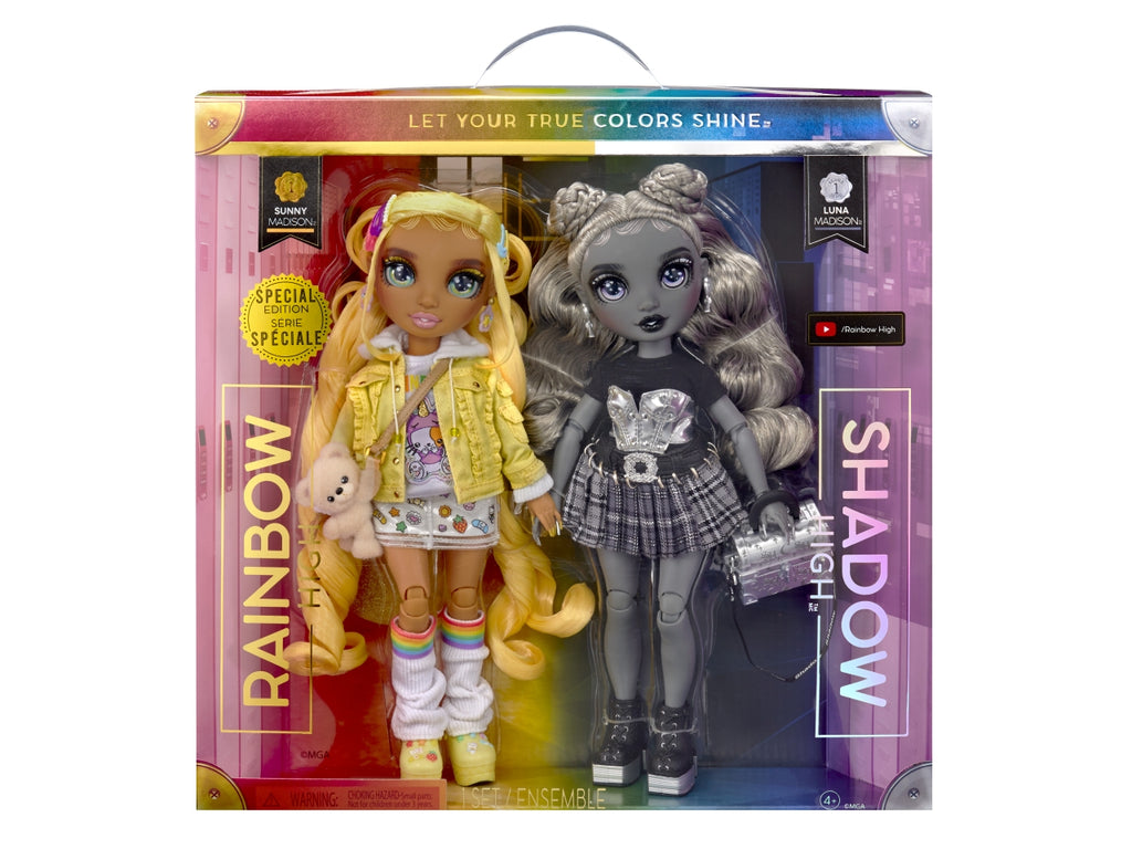 Insieme, con i loro amici della shadow high, le gemelle madison stanno mostrando al mondo che dovresti essere orgoglioso di far risplendere i tuoi veri colori. sunny e luna hanno occhi stupendi, ciglia lunghe e bei capelli pettinabili. esprimono la loro creatività  nei loro accessori. sunny vestita di giallo brillante indossa una maglietta carina con disegni kawaii, gonna, giacca di jeans gialla, scaldamuscoli, c. luna, che ama il nero e il grigio, indossa un top senza spalline con borchie argentate sopra una classica t-shirt nera, gonna scozzese con borchie argentate metalliche, cintura nera con fibbia quadrata argentata lucida, stivali neri pesanti e porta una borsetta argentata in stile scatola per il pranzo. mescola e abbina gli outfit e gli accessori per ispirare tante storie. sunny viene fornita con un,adorabile borsetta di peluche e luna viene fornita con una borsetta argentata in stile scatola per il pranzo. le gemelle madison sono completamente articolate e posizionabili. le lo ro braccia e gambe si piegano per tante pose divertenti! la confezione include: 2 bambole alla moda, abiti completi, scarpe, accessori borsa e un supporto per bambole.