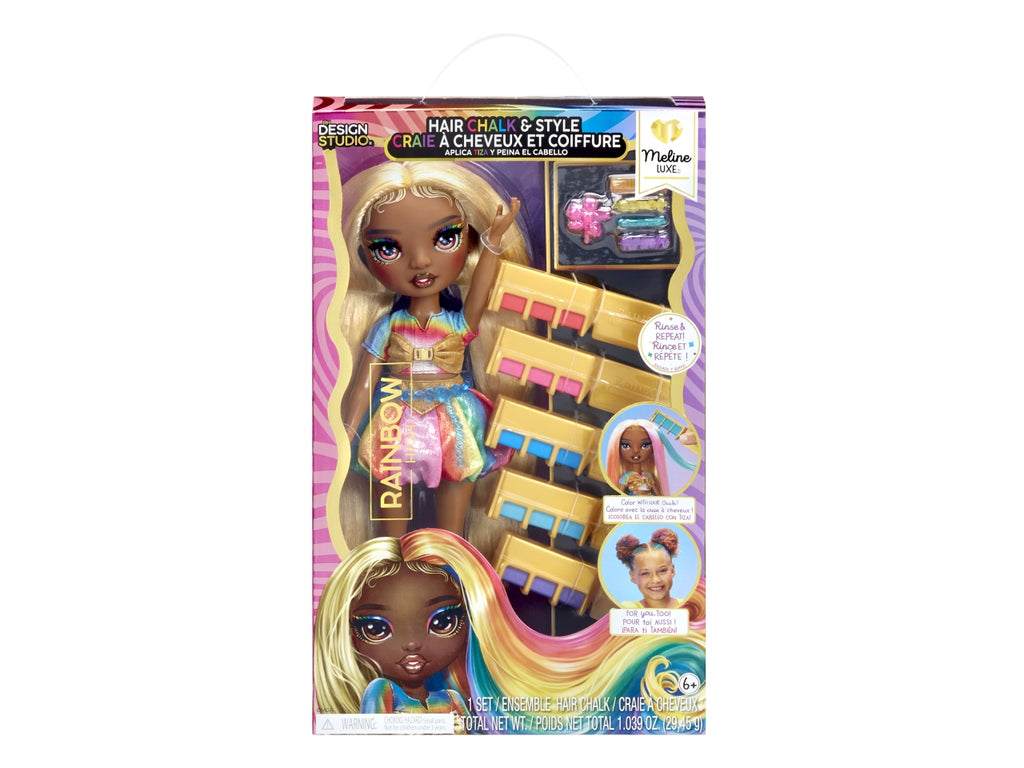 Personalizza i capelli della tua bambola Rainbow High, e anche i tuoi capelli, con i 5 gessetti lavabili per capelli arcobaleno. Il kit, facile da usare, è dotato di 5 gessetti lavabili nei colori dell'arcobaleno, 4 pettini per gessetti e 5 fermagli da usare sulla bambola. I gessetti per capelli lavabili consentono di creare in modo semplice e ripetitivo. Basta lavare i capelli con acqua e sapone, lasciali asciugare e ricomincia a creare. Una volta finito di colorare e acconciare, la bambola è pronta per creare storie infinite! Completa la tua collezione di fashion doll con Amaya e Meline