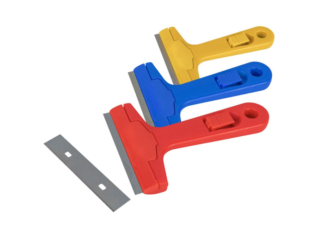 Raschietto con lama da 10 cm ideale per vetro, piastrelle e piani a induzione in vetroceramica. impugnatura in plastica, bottone di sgancio lama. inclusa una lama di ricambio. dimensione: 10x14,5 cm. colori assortiti: rosso, giallo. blu. con lama di ricambio