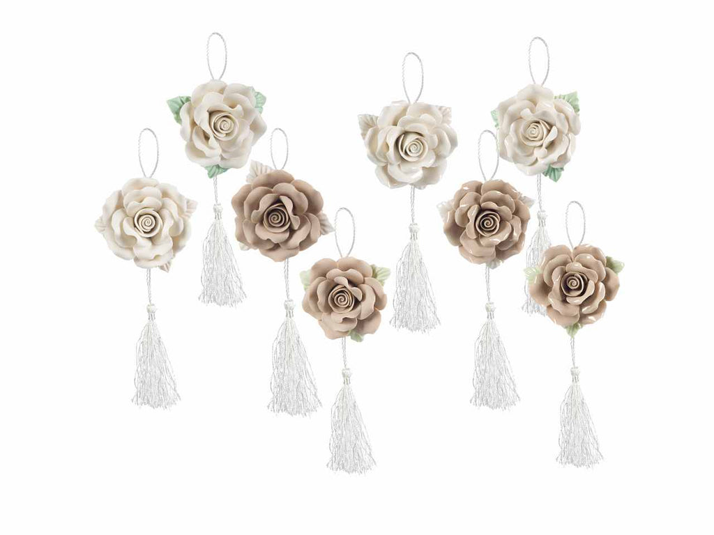 Rosa c/calamita in ceramica e nappetta, 8 assortite: bianche e tortora, opache e lucide, con foglia bianca e verde, misure articolo: d.5.5xh.3.5cm, altezza con nappainclusa 17cm