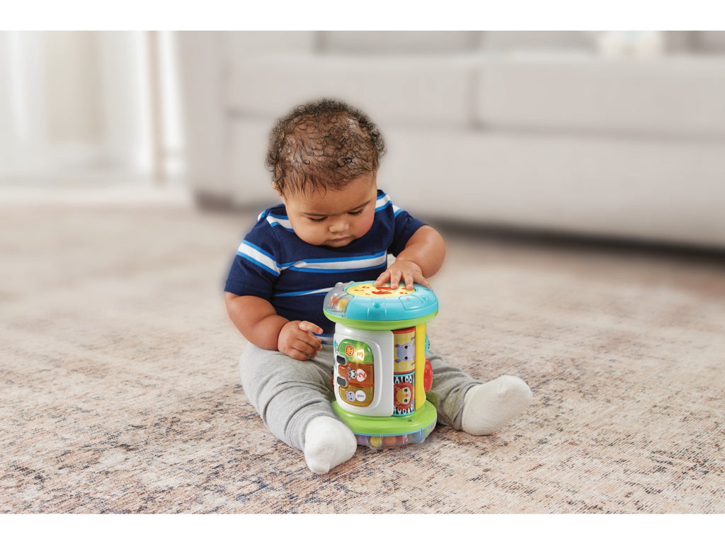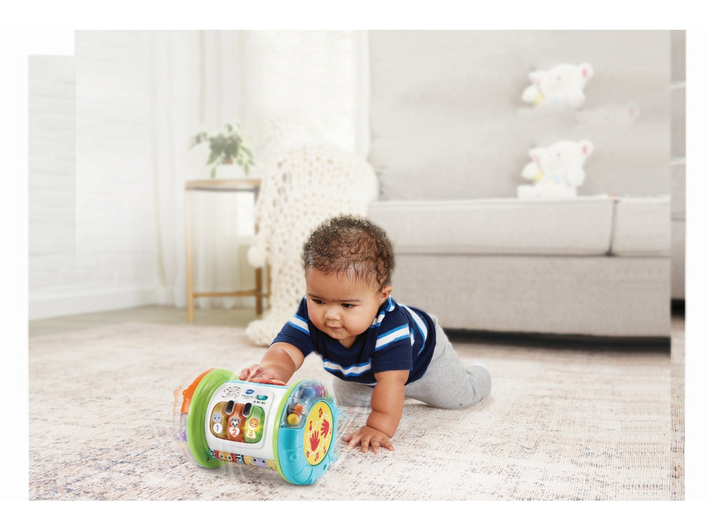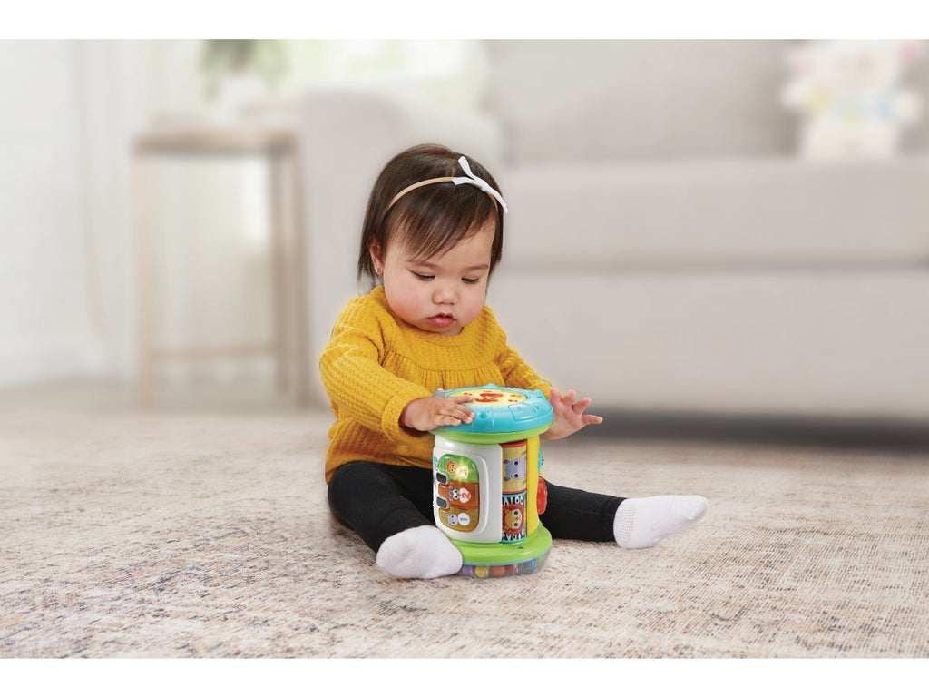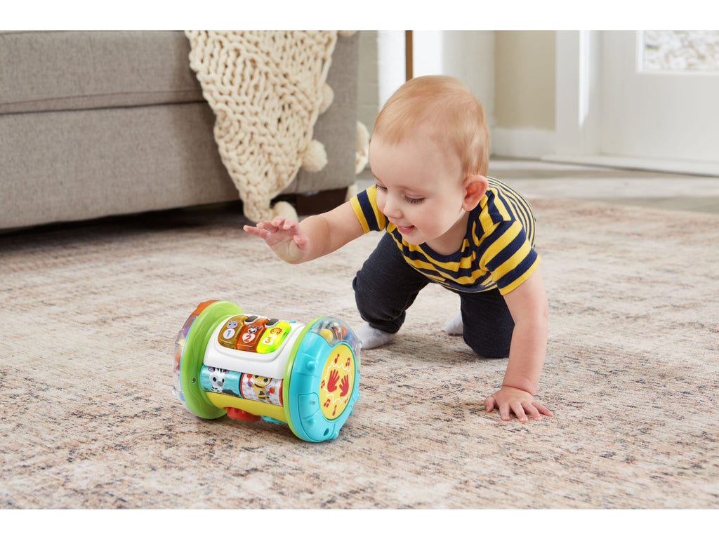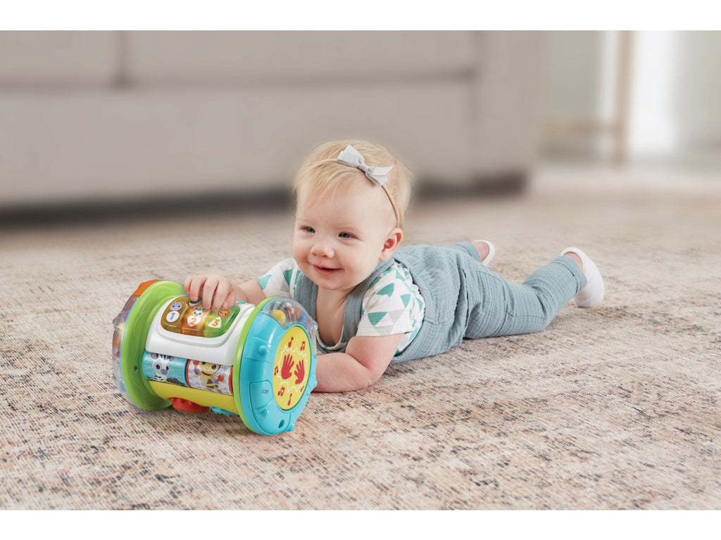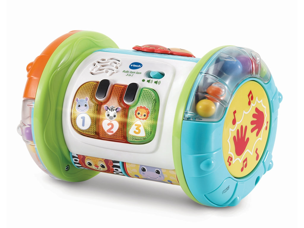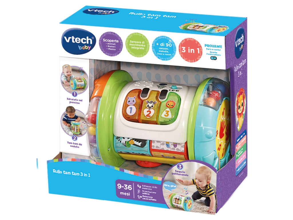 ⢠Il Rullo tam tam cresce con il bambino grazie alle sue 3 modalità di gioco: - Suono e mi diverto - il bambino suona i tasti del pianoforte o batte le manine sui due grandi pulsanti tamburo. - Sto seduto e scopro - i diversi lati del rullo sviluppano la motricità fine grazie alle tante attività . - Gattono ed esploro - il rullo incoraggia la motricità globale, stimolando il bambino a gattonare per seguirlo. ⢠3 tasti pianoforte luminosi per scoprire numeri, colori e animali. ⢠Tante attività : perline colorate da ruotare, ingranaggi da manipolare, palline colorate e una coccinella da far scorrere per sviluppare la motricità fine. ⢠Sensore di movimento: il bambino attiva canzoni e melodie scuotendo, spingendo e facendo rotolare il rullo. ⢠7 canzoni e 18 melodie ⢠Controllo del volume e spegnimento automatico.