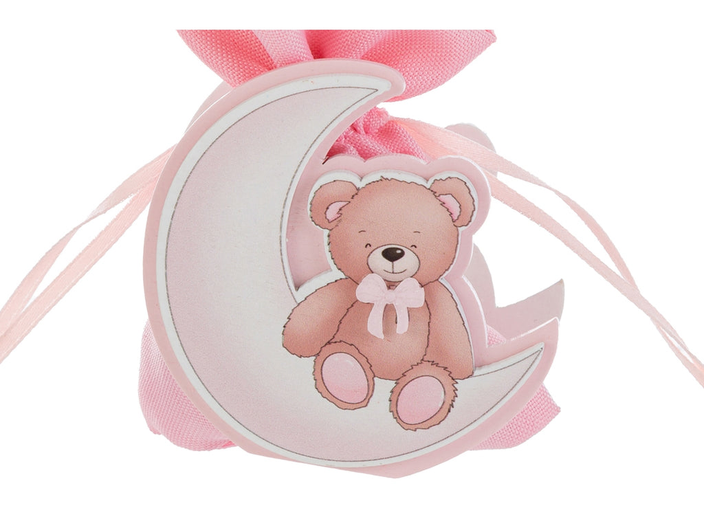 Un raffinato sacchetto in legno rosa impreziosito da un dolce orsetto e decorazioni della luna è la scelta perfetta per celebrare momenti speciali. Ideale come bomboniera, aggiunge un tocco delicato e originale a occasioni importanti come una nuova nascita o un battesimo. Dimensioni compatte di 7×3,5xh7 cm, perfetto da abbinare ai vostri ricordi più preziosi.