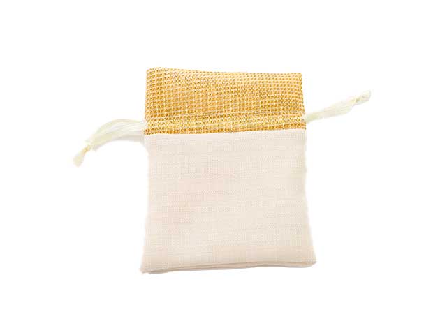 Sacchetto di cotone con decorazioni dorate per contenere i confetti da offrire come bomboniera in occasione dei 50 anni di matrimonio o nozze d'oro. dimensioni: 8 x 10 cm