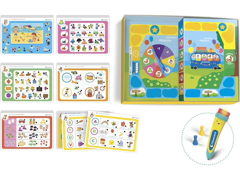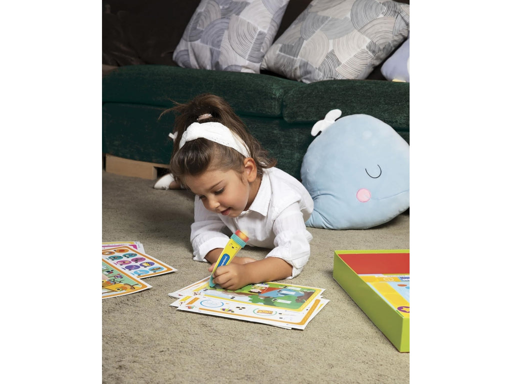 Gioco educativo con penna interattiva e oltre 1000 quiz che stimolano osservazione, ragionamento e linguaggio, con attività su lettere, numeri, forme e colori per apprendere in modo graduale e divertente.