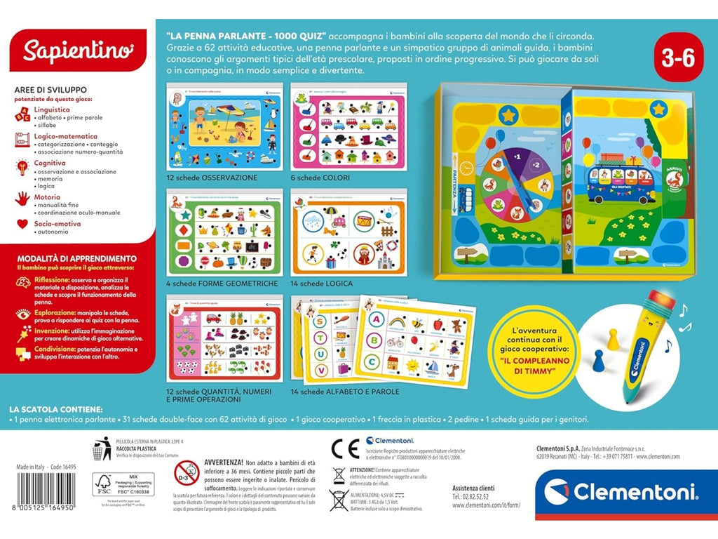 Gioco educativo Sapientino Made in Italy adatto per bambini dai 3 ai 6 anni, include penna interattiva, tessere a incastro e schede illustrate con oltre 1000 quiz, batterie incluse; sviluppa logica, linguaggio, memoria e coordinazione.