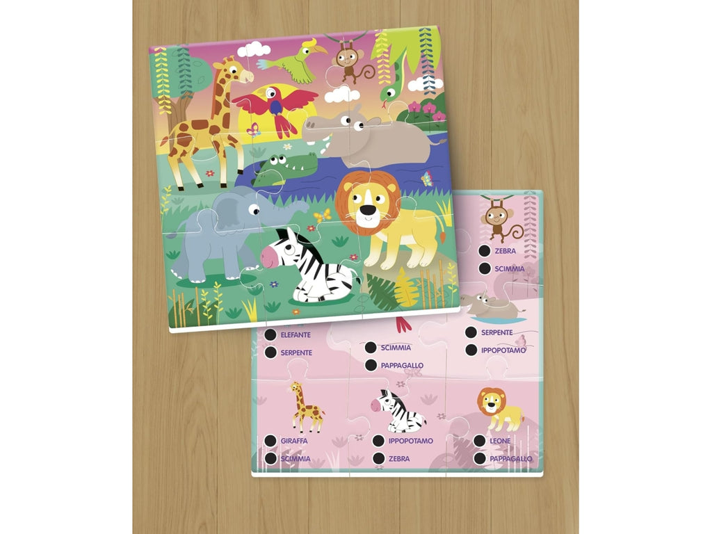 Le schede illustrate e il puzzle propongono sfide educative coinvolgenti per riconoscere lettere, associare immagini e quantità, arricchire il vocabolario e stimolare la memoria visiva e uditiva in un contesto di gioco divertente.