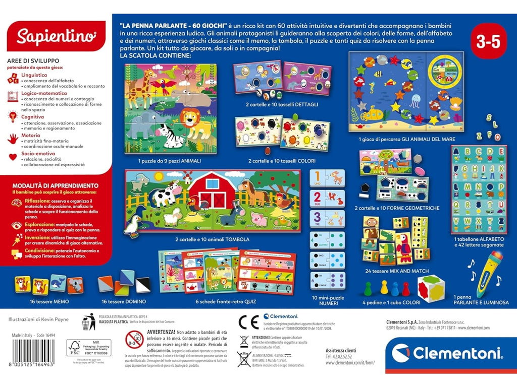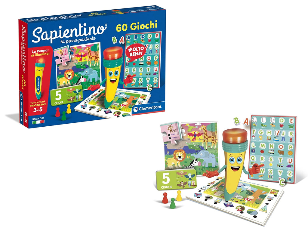 Gioco educativo Sapientino Made in Italy per bambini dai 3 ai 5 anni, include penna interattiva, puzzle e schede illustrate a colori, batterie incluse per iniziare subito a giocare; stimola linguaggio, logica, coordinazione e curiosità.