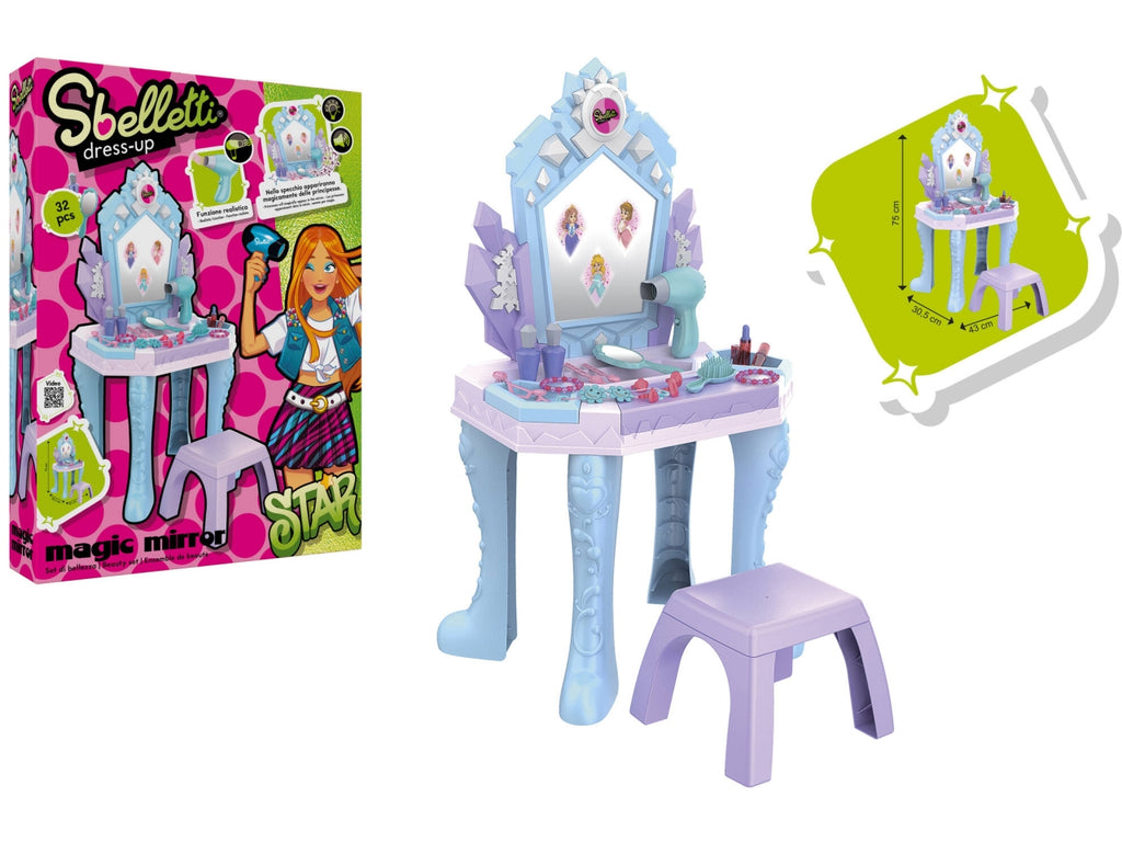 Specchiera delle favole, dal design unico e ricercato, con funzioni interattive. Attiva luci e suoni per un'esperienza di gioco davvero unica come lo sei tu. Ampi vani per riporre i tuoi gioielli, grande specchio centrale e tanti accessori, tra cui phon e spazzole, renderanno la bellezza un mondo magico da scoprire. Funzionante a batterie. Con luci, suoni e melodie. Dimensioni L 43 x P 30,5 x H 75 cm. Sgabellino incluso.