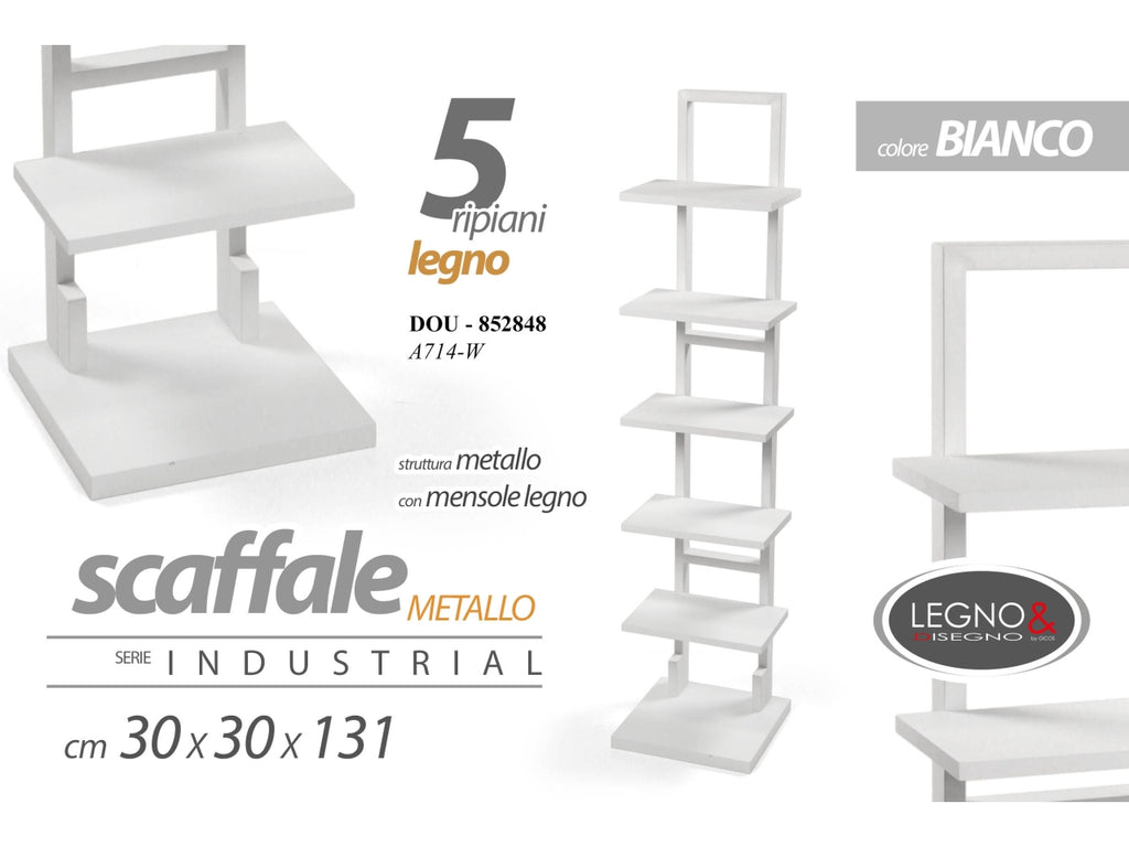 Scaffale colore bianco in stile industrial con struttura in metallo e 5 mensole in legno misura 30x30x131cm