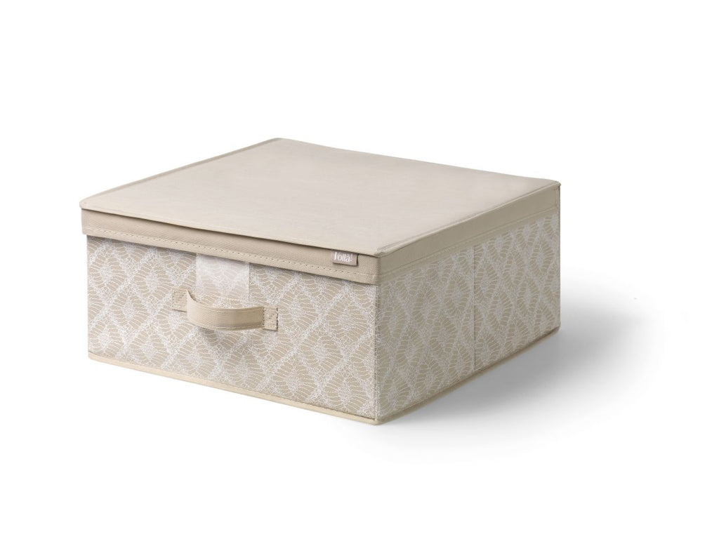 Scatola in tnt "macramè" colore: beige 45x45x20 cm. dotata di rigida struttura interna in cartone, il tessuto non tessuto e' un materiale altamente traspirante, resistente agli strappi e lavabile con un panno bagnato.