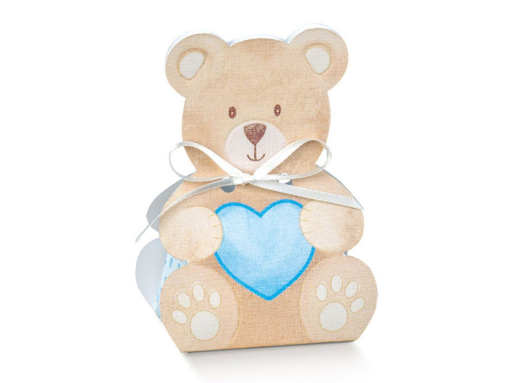 Scatola in cartoncino teso a forma di orsetto, per contenere confetti, prodotti dolciari, piccoli oggetti. e' provvista di fori per la legatura con nastro.