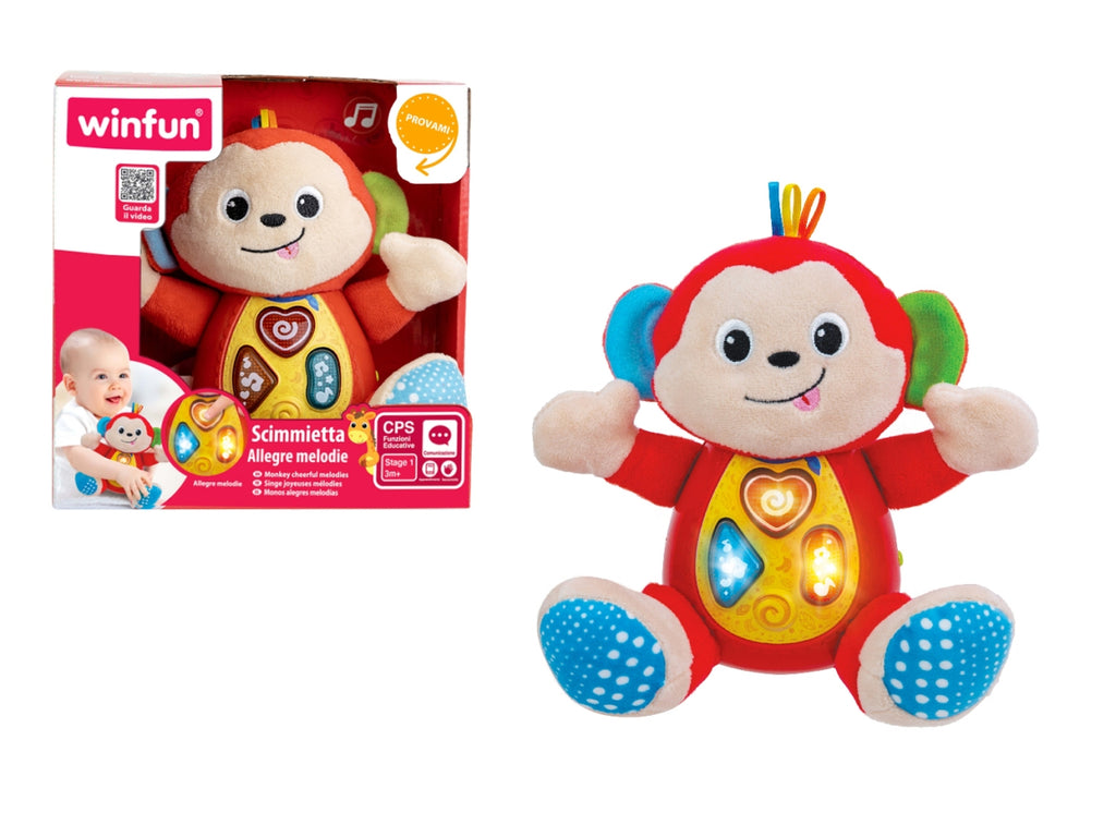 La scimmietta interattiva di Winfun diventa il migliore amico del tuo bambino. Sviluppa l'immaginazione, incoraggia la stimolazione sensoriale, sveglia la curiosita' e l'apprendimento: 3 pulsanti luminosi attivano frasi in rima e apprendimento semplice. Melodie divertenti e allegre. Strani effetti sonori.